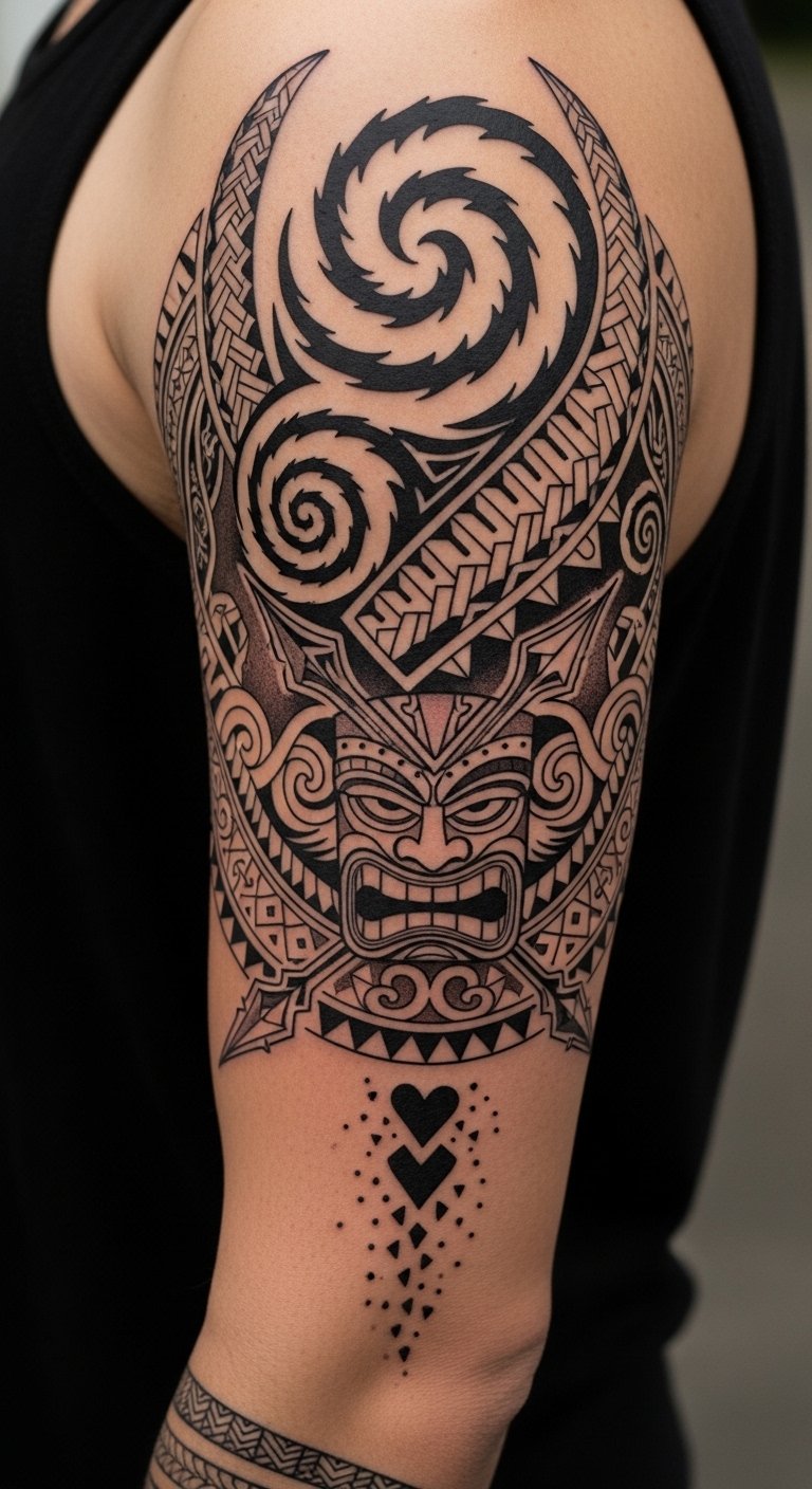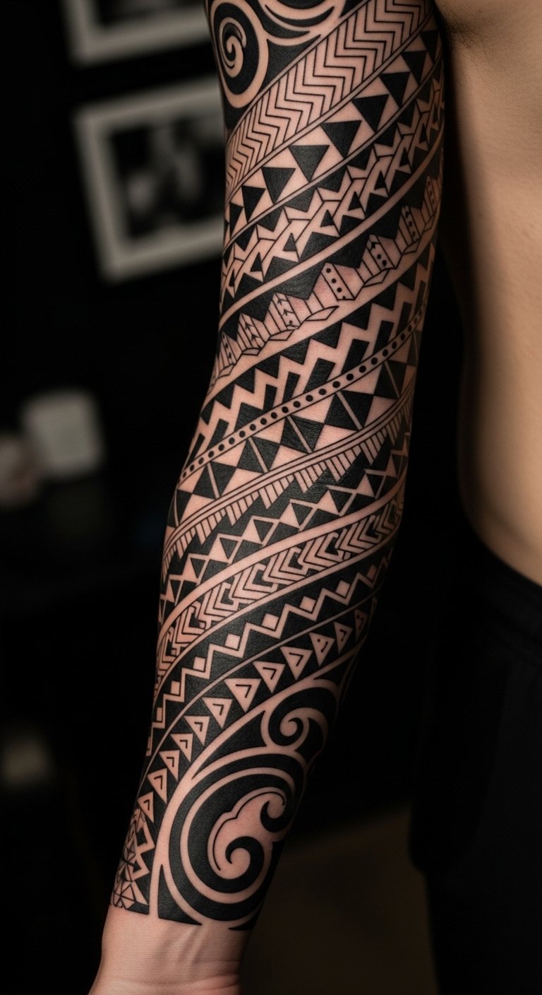 Place along the upper arm flowing to the forearm for a continuous narrative; the bold geometric elements evoke protection and courage, the waves signify life’s passages and adaptability, and the koru-inspired curves soften the composition with regeneration and hope—intended to be seen from both distance and close, eliciting pride and quiet determination.
