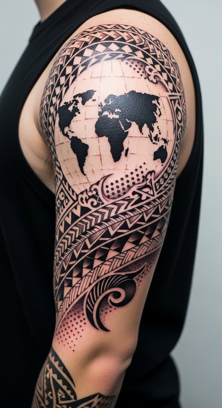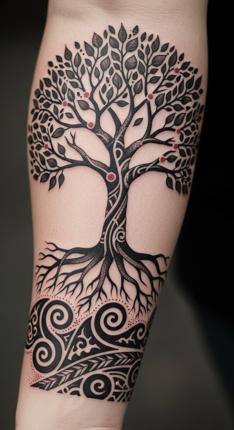 Through these tattoos, you reclaim your roots, honoring those who came before you, and embracing the freedom to express who you truly are. The design’s intertwined tree and traditional motifs symbolize generational continuity and the flow of heritage; roots becoming waves speak to migration and resilience, while red nodes mark pivotal ancestors or life events.