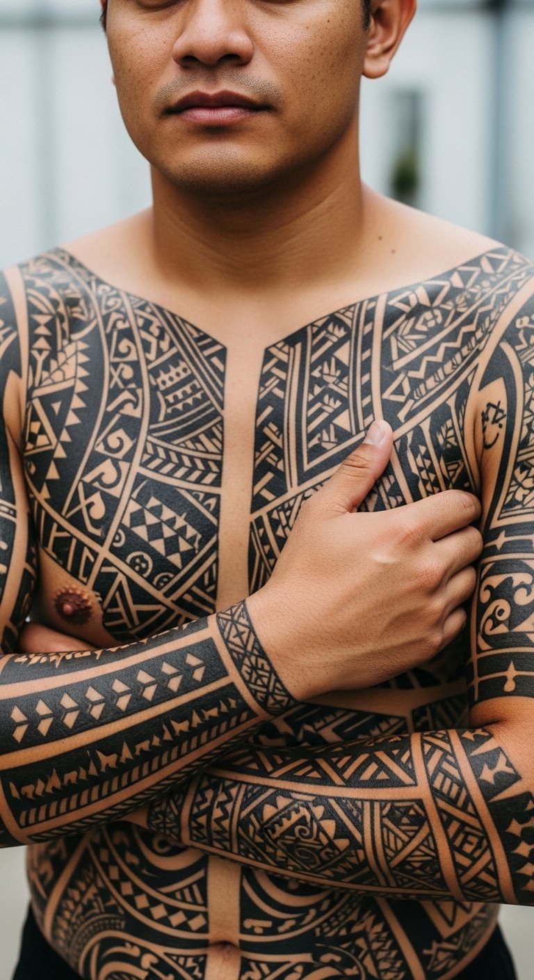 A full-sleeve and chest tattoo design blending traditional Samoan motifs—geometric lunettes, spearheads, shark teeth, and mata’ora patterns—flowing organically from shoulder to sternum; rendered in bold black ink with negative-space filigree and subtle dotwork for texture. Symbolism: lineage and tradition are represented by interconnected bands and family emblems, while spearheads and shark teeth convey strength and protection; negative space channels freedom and spiritual connection. Emotionally the piece evokes pride, resilience, and belonging. Ideal placement: right shoulder across chest and down the entire arm to the wrist, wrapping to follow musculature so design reads from multiple angles.