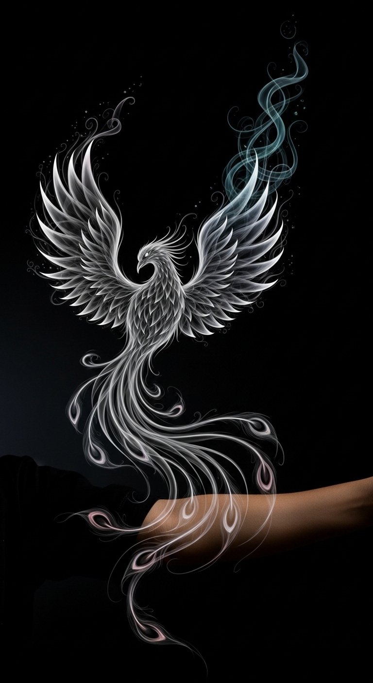 This design uses the smoke’s movement to symbolize continuous change and resilience; embedded tiny symbols (seed, feather, broken chain) represent beginnings, lightness, and release.