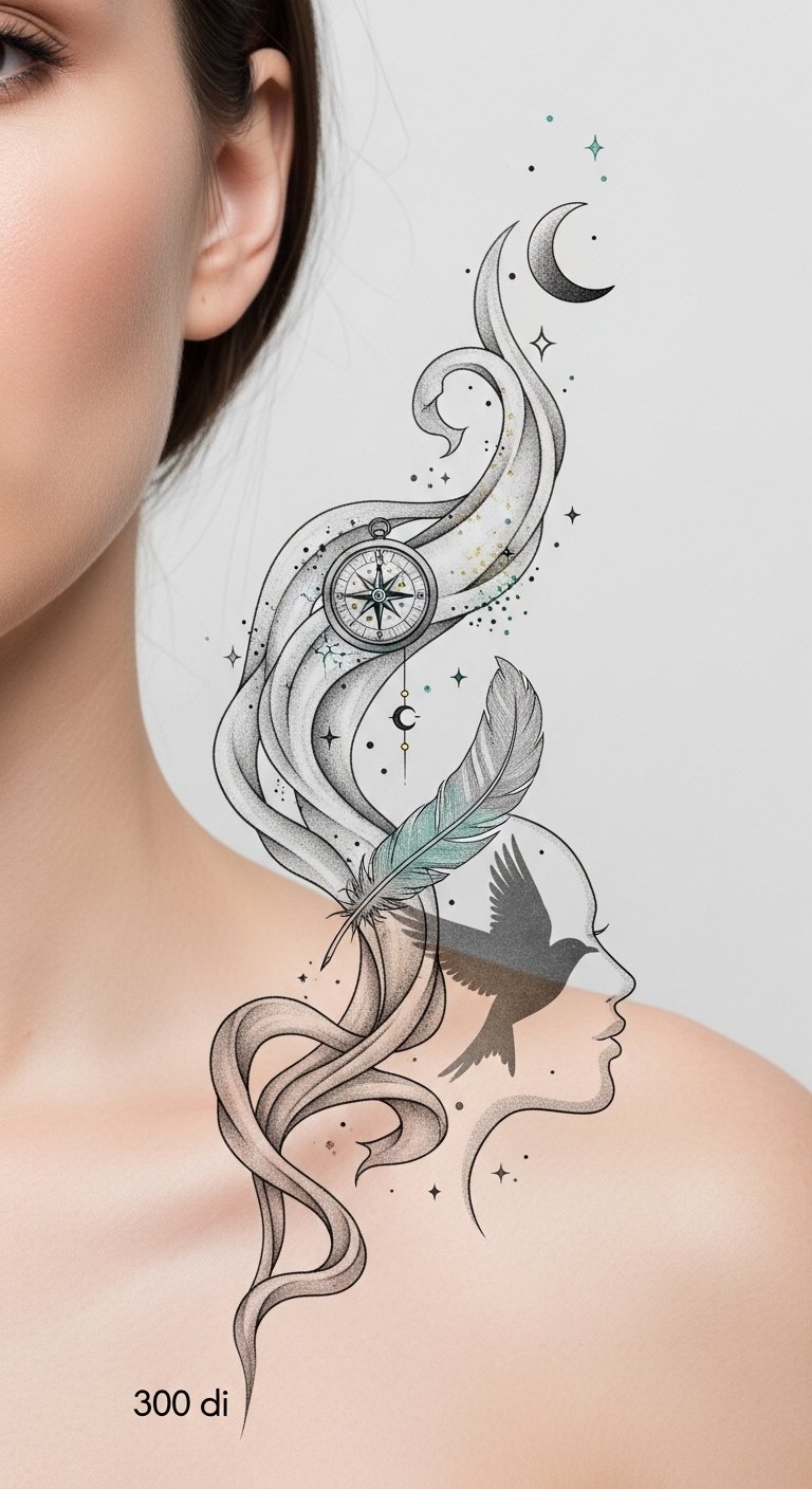 This design channels that text’s themes into visual symbolism: the compass for direction amid change, the hourglass for transience, and the feather for lightness and liberation, rendered in soft, emotive lines to evoke motion and vulnerability; ideal placements like the inner forearm or ribcage allow intimate viewing and mirror the personal, ever-changing journey the tattoo represents.