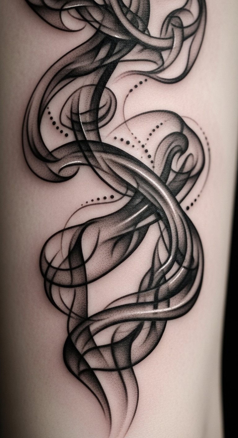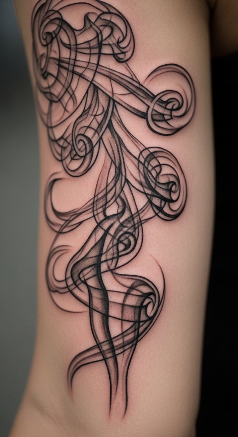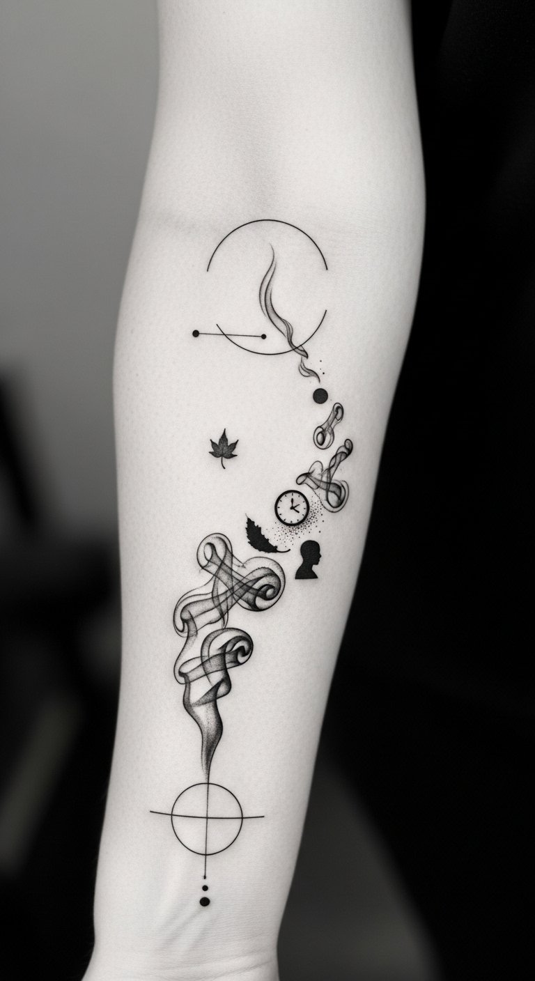 A flowing smoke tattoo that begins at the shoulder and trails down the forearm, composed of soft gray-to-ink gradients forming elegant swirls, curls, and subtle negative-space silhouettes of moments (a small bird, a wilted petal, a rising sun) embedded within the wisps; this design symbolizes the transient nature of life and personal transformation, evoking a bittersweet, liberating emotion—perfect for visible placements like the outer forearm, clavicle, or calf where the movement of the smoke complements the body’s lines and invites quiet reflection.