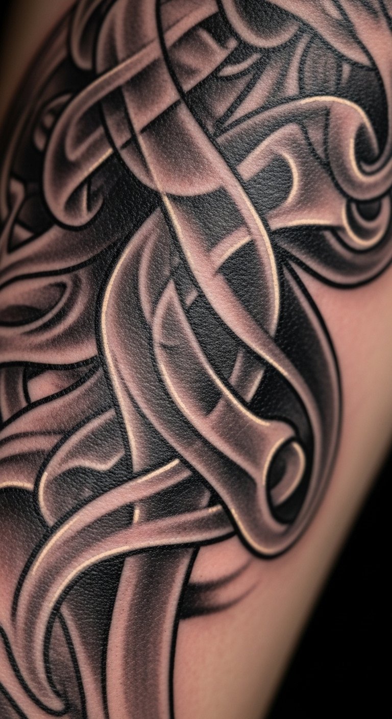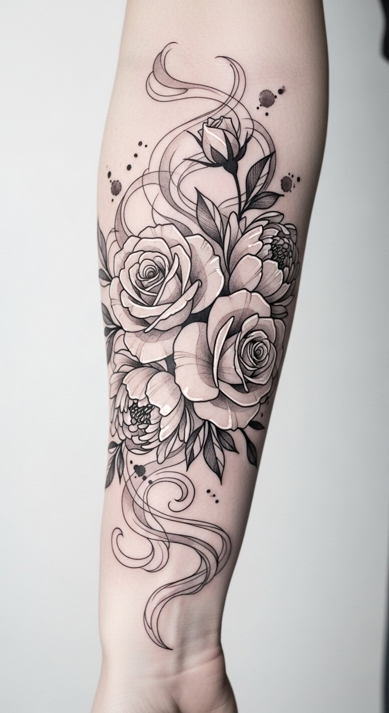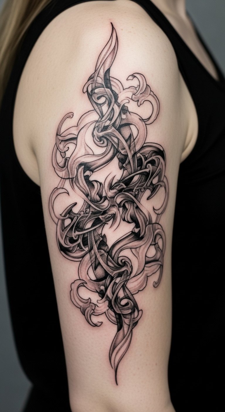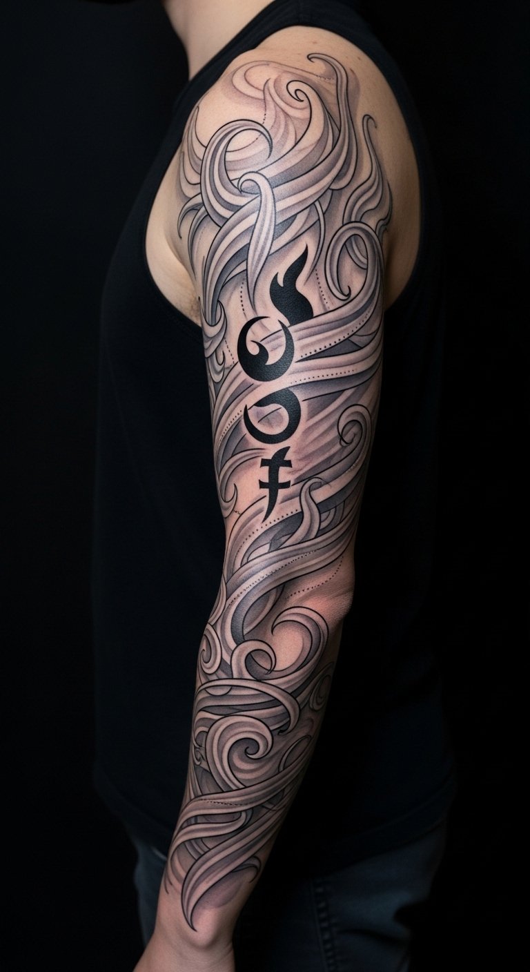 Placement as a full or half sleeve works well: let smoke trail from shoulder to wrist, wrapping around contours, with solid motifs interrupting and grounding the flow at key points such as the outer bicep, inner forearm, and near the wrist for focal balance.