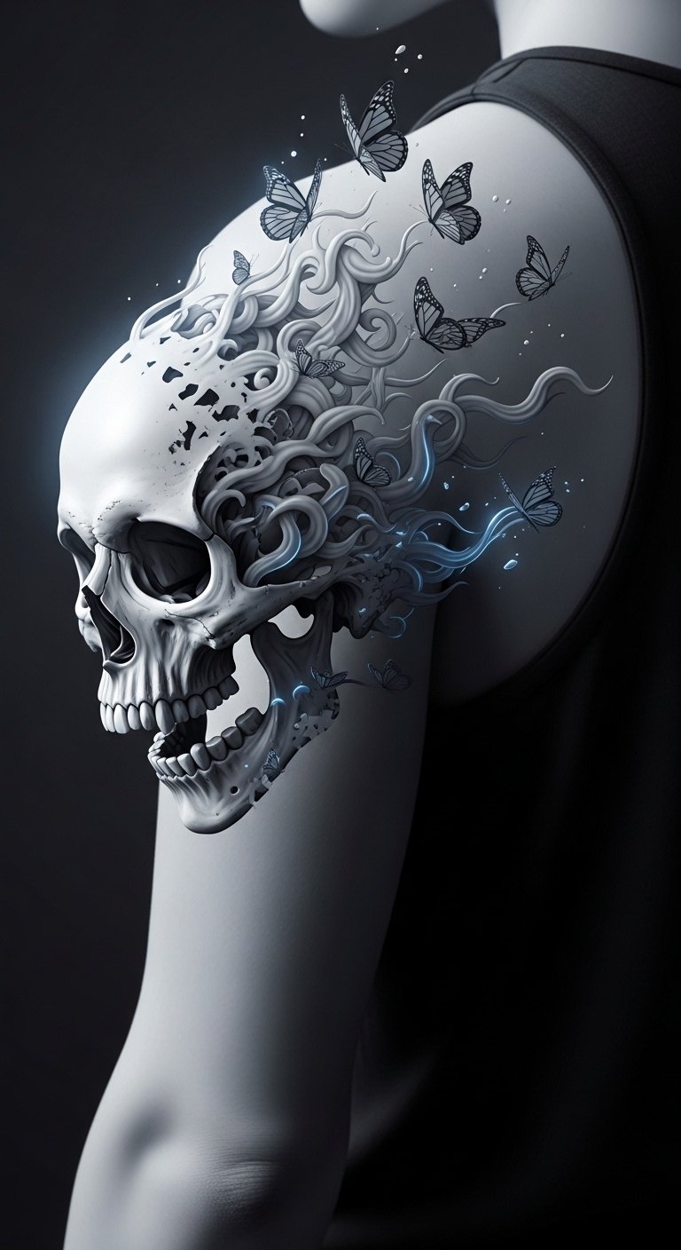 A flowing shoulder-to-scapula tattoo where rising smoke morphs into delicate, semi-transparent forms—petals, birds, and faint script—symbolizing impermanence and transformation; soft grey washes and negative space create depth and motion, while subtle white highlights suggest light catching transient moments. Emotionally the piece balances melancholy and hope, honoring loss and change while celebrating beauty found in brief instants. Placement across the shoulder blade allows the smoke to trail naturally with body movement, making the design feel alive and ever-shifting.