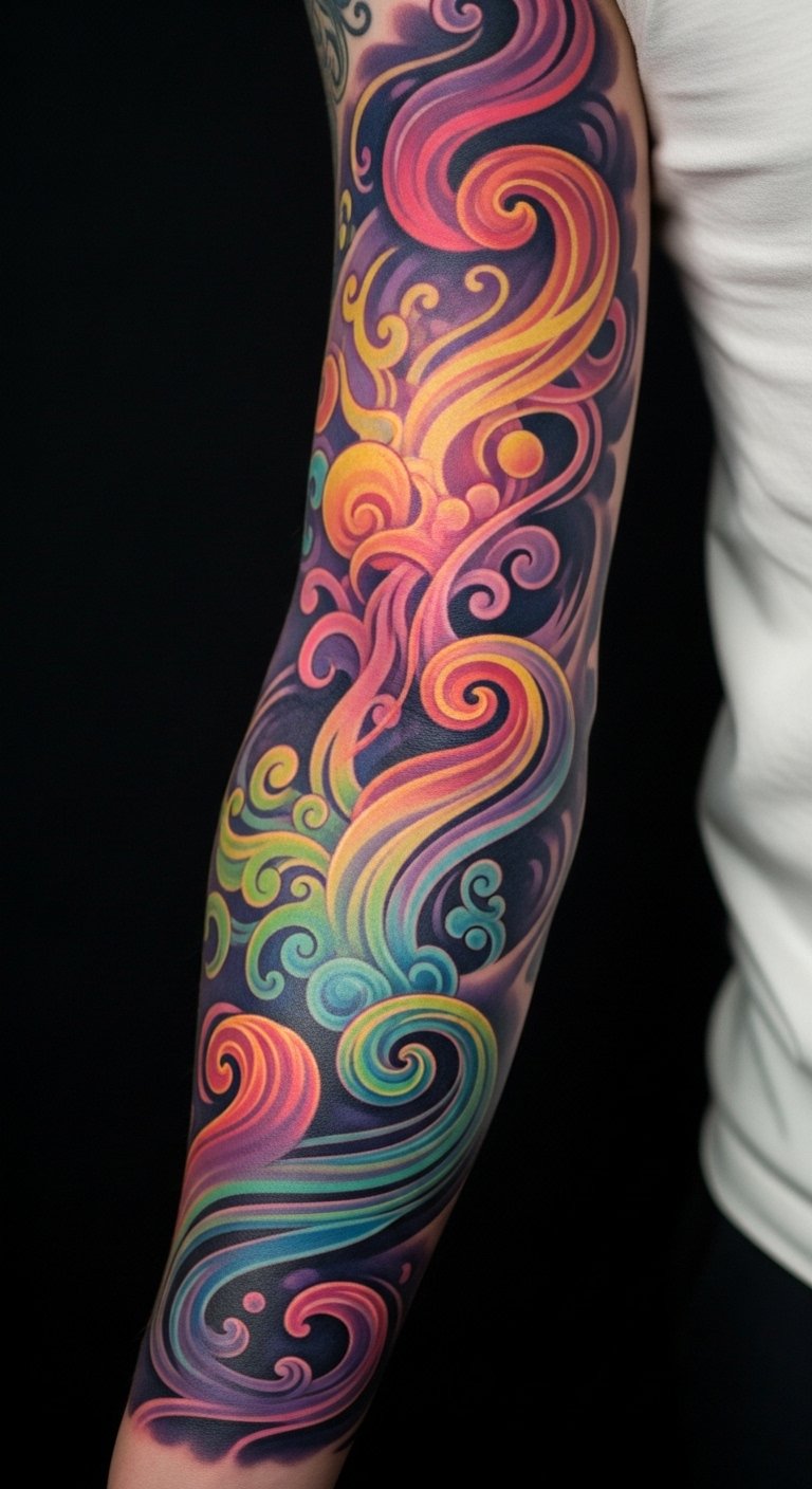 Emotionally it evokes motion, wonder, and a dreamlike state through its flowing forms and luminous colors. Ideal placement is a full arm sleeve wrapping from shoulder to wrist, with denser, darker elements near joints for depth and lighter, airy gradients on flatter surfaces to emphasize movement and visibility.