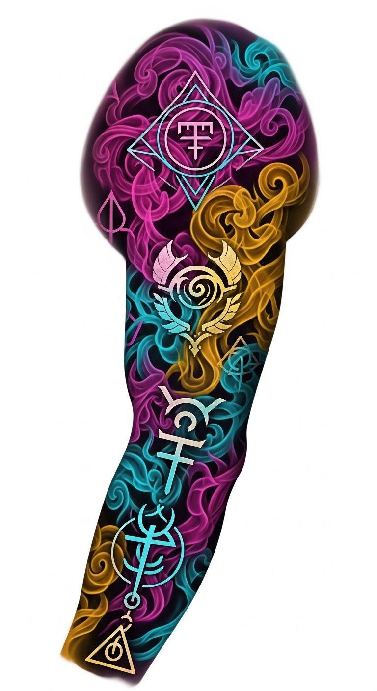 A sleeve or back-piece design where multicolored smoke swirls organically around a central figure (skull, phoenix, or abstract silhouette), using high-contrast hues—teal, magenta, gold, indigo—blending softly at edges and punctuated with sharp highlights; symbolism centers on transformation and self-expression, emotion conveyed through energetic movement and luminous color contrasts; ideal placement: full arm sleeve wrapping into shoulder and chest or a dramatic upper-back piece to allow the smoke’s flow and depth to read from multiple angles.
