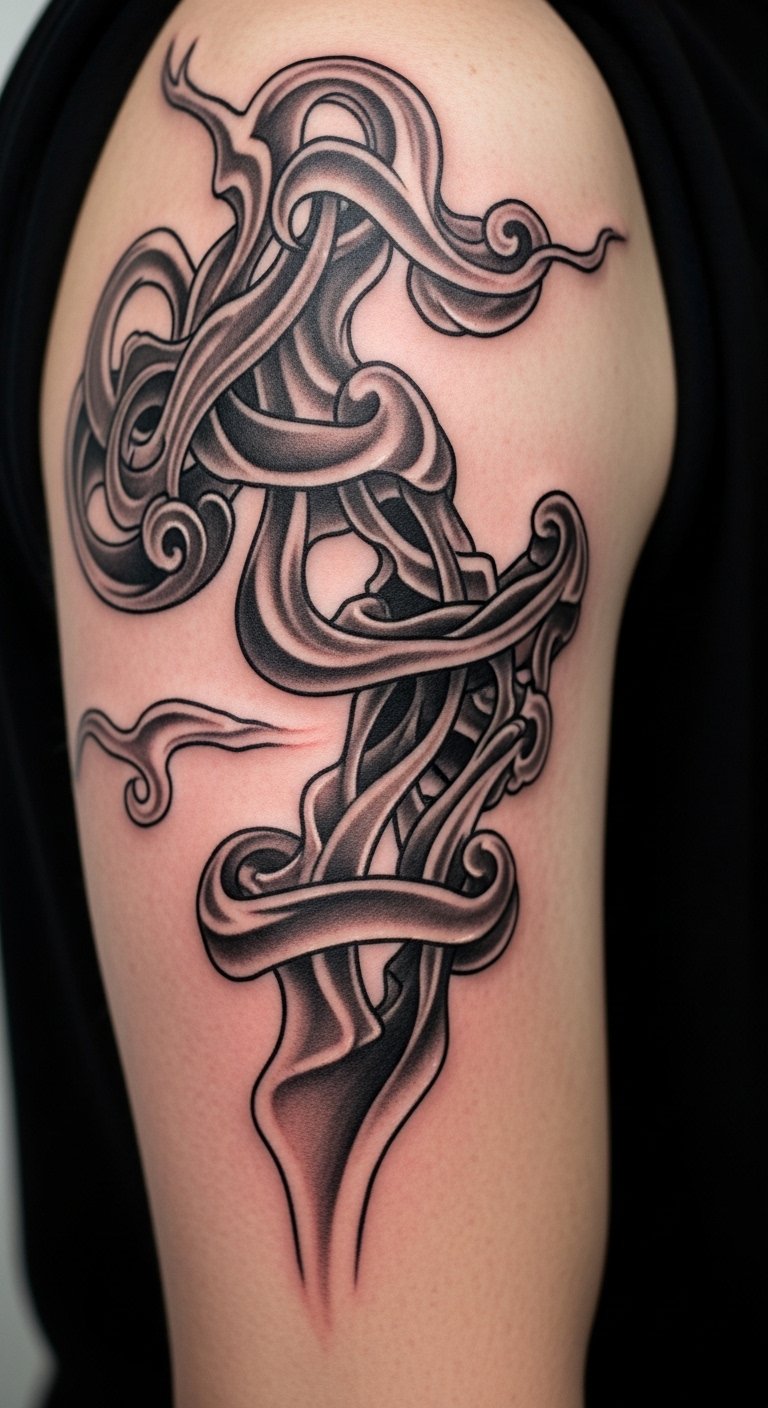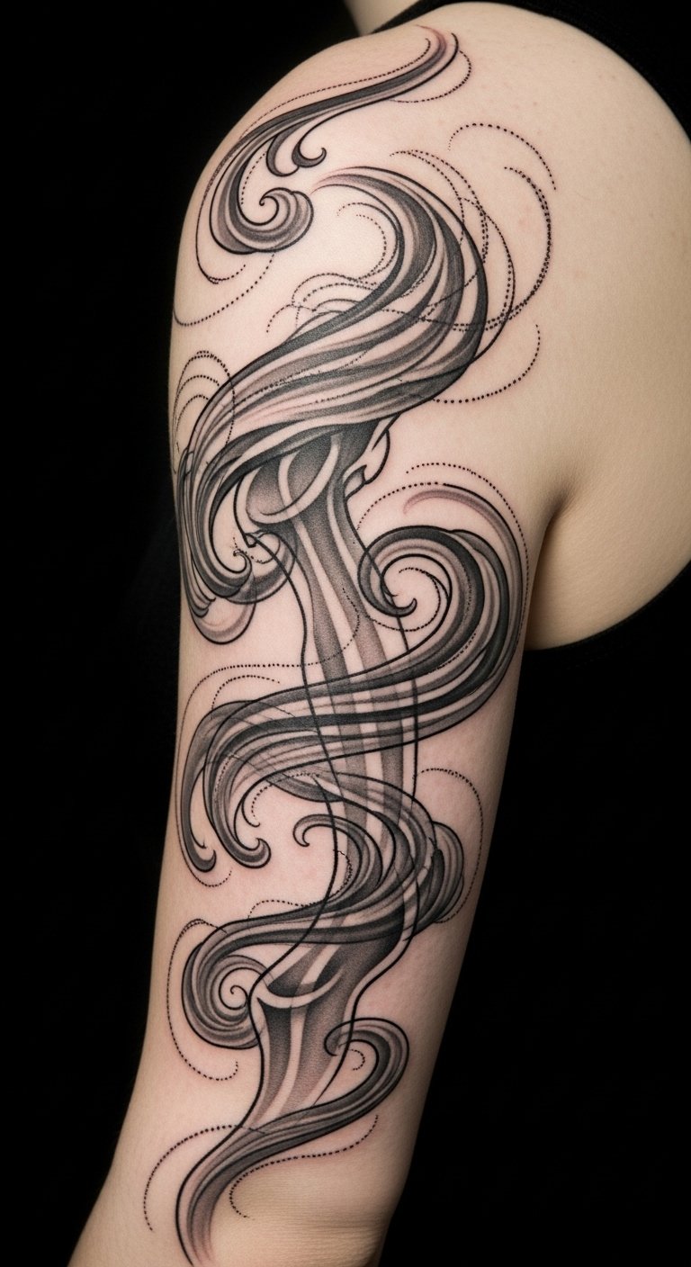 Emotionally, the piece balances movement and calm—hopeful momentum softened by reflective shadows—suiting someone commemorating personal growth. Placement along the upper arm or across the upper back allows the smoke’s flow to follow natural contours, letting tendrils wrap and lead the eye with the wearer’s movement.