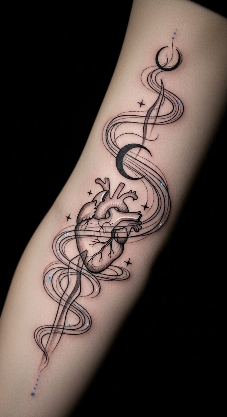 This design concept uses the smoke’s fluid motion to symbolize transition, vulnerability, and the ephemeral nature of emotion, with the anatomical heart representing inner truth and the crescent moon suggesting cyclical change; the cool blue accents evoke calm introspection while the fine-line tendrils and negative space convey breath and movement.