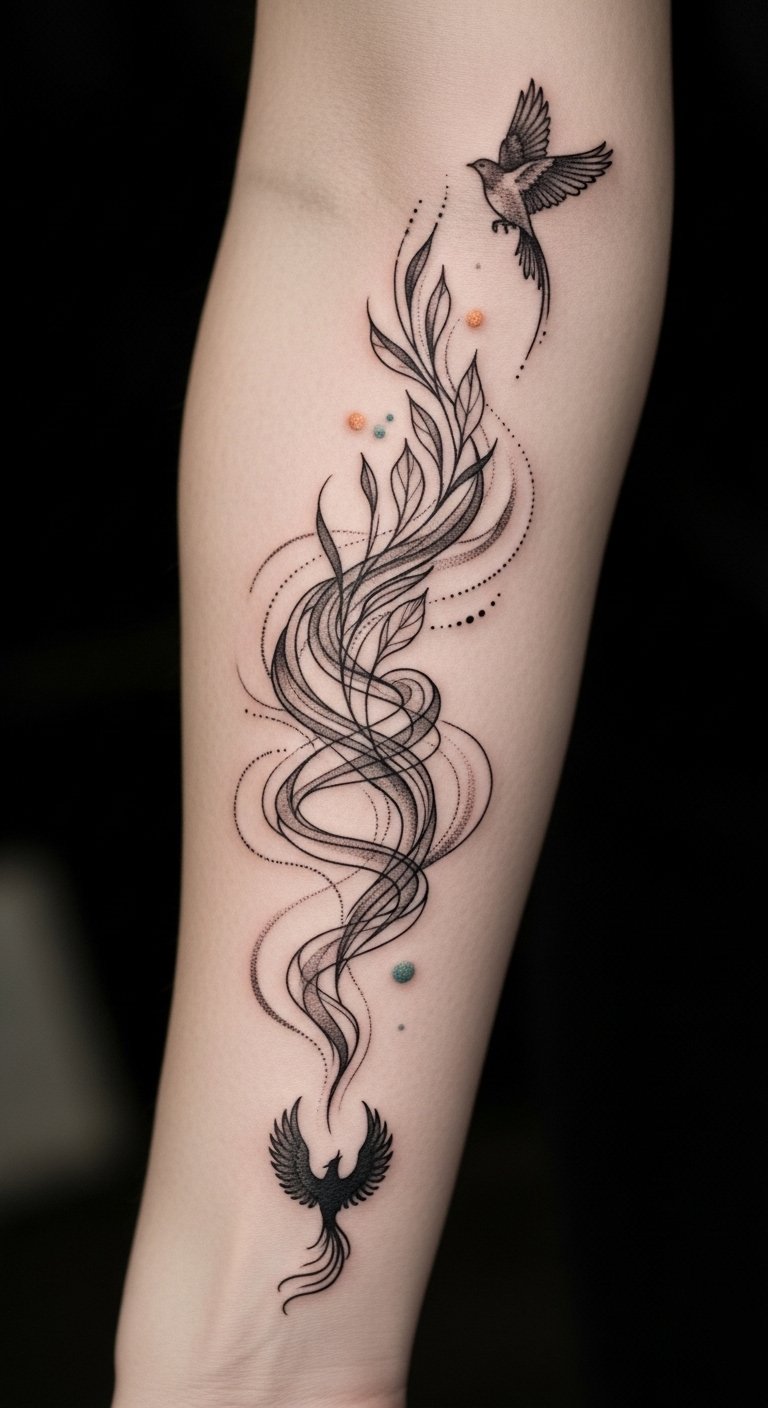 The design blends ephemeral smoke with botanical growth and a bird to convey renewal and emergence; fine-line shading and negative space create gentle motion and introspection, evoking calm determination—ideal for the forearm where it reads as a personal narrative and can be expanded into a sleeve or kept intimate and discreet.