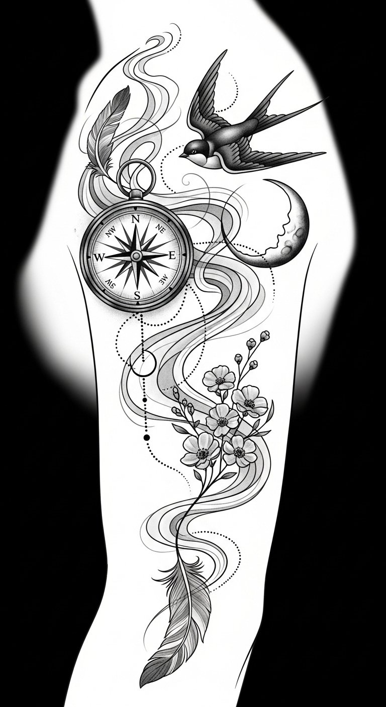 The composition uses the compass as guidance and the swallow as freedom, linked by smoke that symbolizes transition and the invisible ties between choices and journeys; the crescent moon introduces introspection and cycles, while the wildflowers add grounded tenderness.
