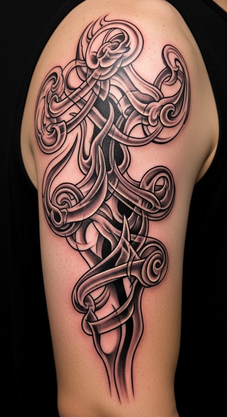 Each swirl can symbolize your journey, making your sleeve uniquely personal and striking. This design uses the smoke’s transient nature to represent change, release, and the passage of time; the negative-space silhouettes embedded within the wisps let the wearer hide intimate symbols or milestones in plain sight, while the gradual shift from dense curls near the shoulder to airy tendrils at the wrist evokes progression and movement—ideal for wrapping around the arm’s contours so the imagery reads continuously from every angle and complements musculature and bone structure.