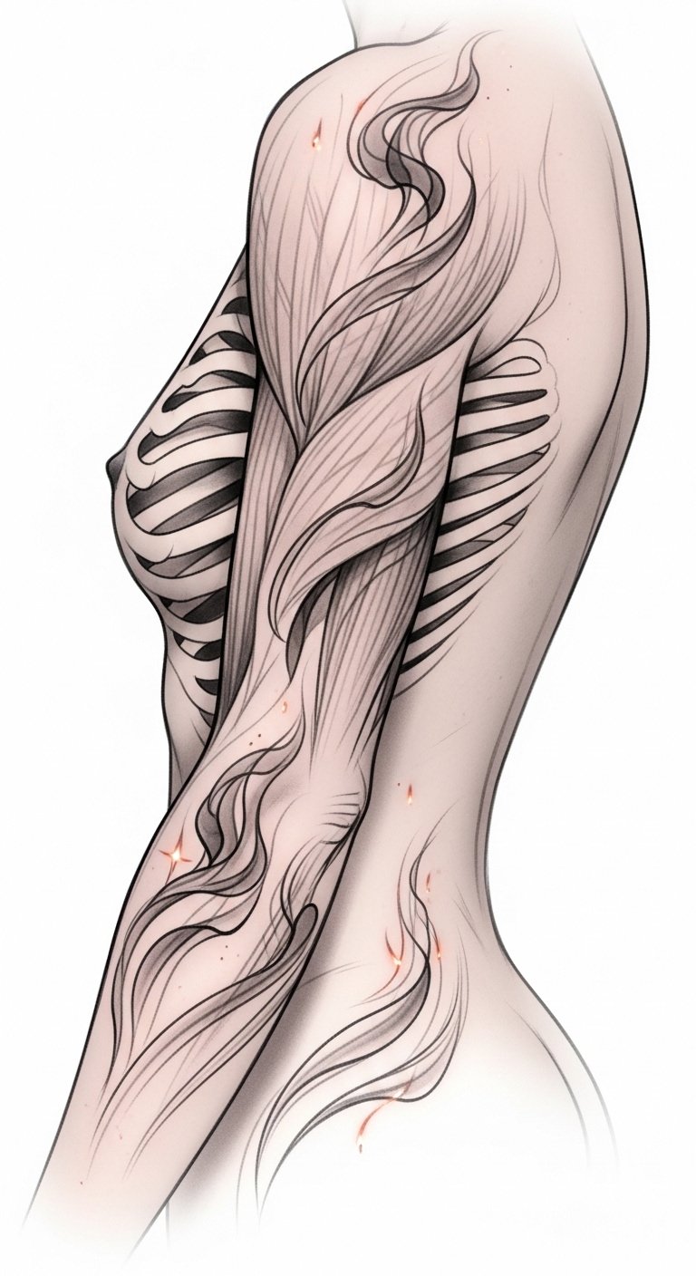 This design symbolizes transformation, impermanence, and the interplay between strength and softness; placed along the ribs it feels intimate and hidden, along the forearm it reads as graceful motion, and over the shoulder blade it accentuates the shoulder’s sweep—eliciting quiet emotion and a sense of personal evolution.