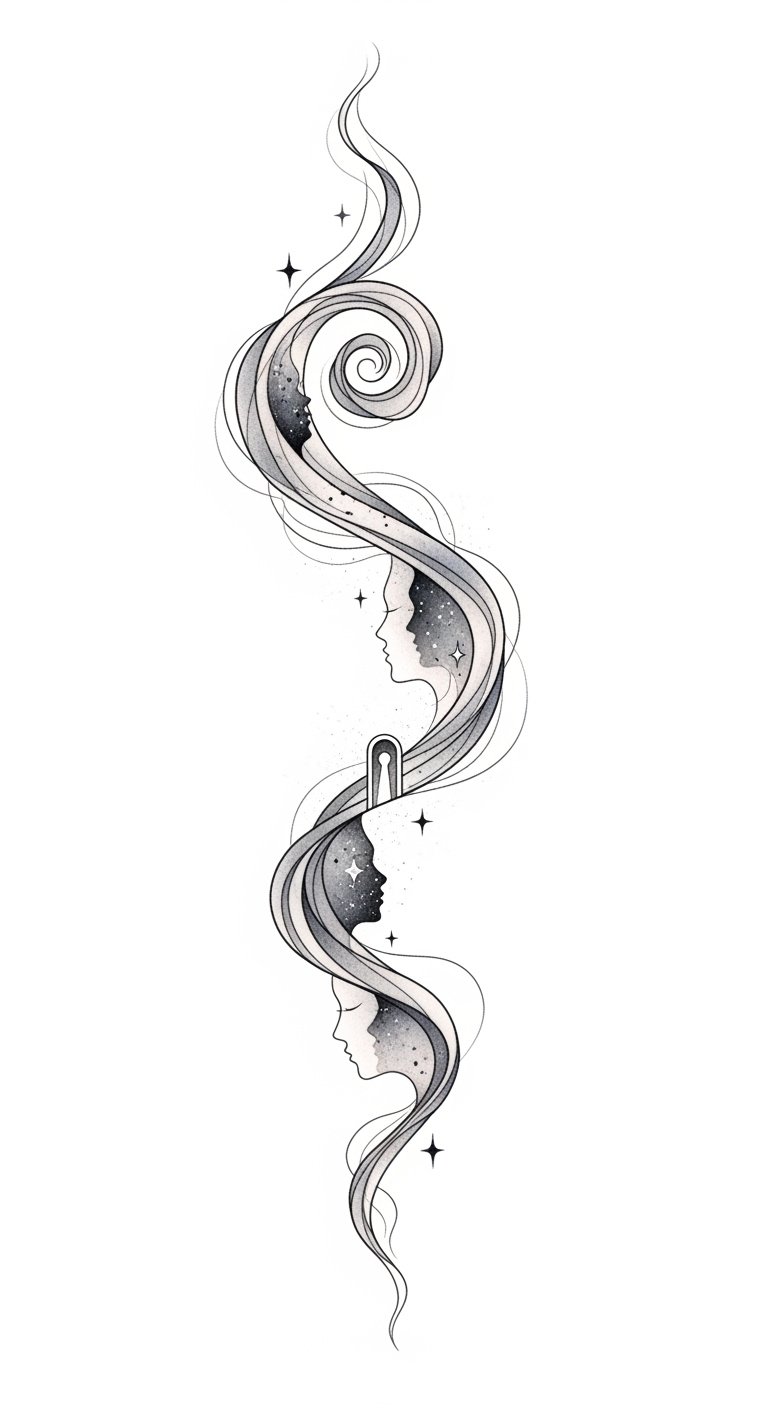 This design concept translates the original lines into a visual: flowing smoke ribbons that transition from fine, dissipating wisps into dense, ink-black spirals, with subtle highlights that suggest light sources and depth. Symbolically it represents the coexistence of impermanence and endurance—moments that fade yet leave lasting marks. Emotionally it balances turmoil and calm, offering catharsis and acceptance. Ideal placements include along the forearm or ribcage where the elongated form can follow body contours, or between the shoulder blades for a centered, expansive statement.