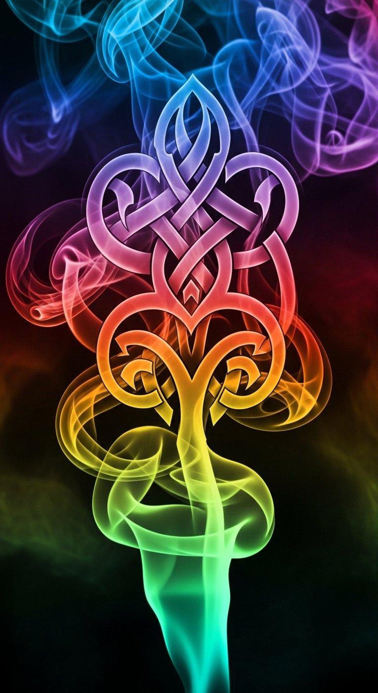 This concept pairs ephemeral, flowing smoke with steadfast motifs to symbolize the balance between change and permanence; geometric shapes bring order and structure while mythical symbols evoke personal mythology and timelessness.