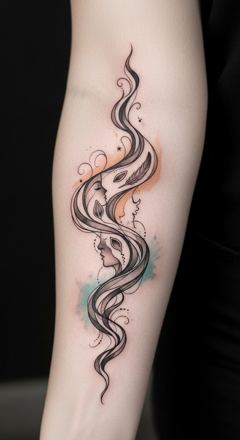 The grayscale with warm and cool accents evokes both melancholy and hope, while negative space invites personal interpretation. Ideal placement is along the inner forearm or side rib where the flow can follow natural lines, allowing quiet intimacy and visibility when you choose to share the story.