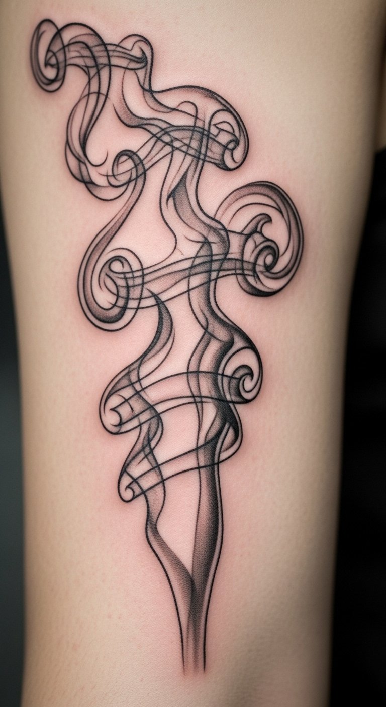 Ideal placement flows along the forearm, ribcage, or shoulder blade where the elongated smoke can trail with body movement, enhancing the illusion of motion and allowing the interplay of light and dark to read clearly from multiple angles.