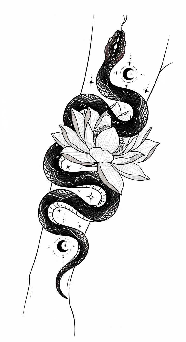 Each design can reflect resilience and rebirth, reminding you of your capacity to shed old skin and emerge anew, ready to conquer the world with undeniable confidence. This design blends the snake’s transformative energy with the lotus’s purity to evoke renewal and inner power; the geometric scale details suggest structure and resilience while celestial motifs add timeless guidance—ideal on the forearm for visible affirmation or along the ribcage for a more intimate, protective placement.