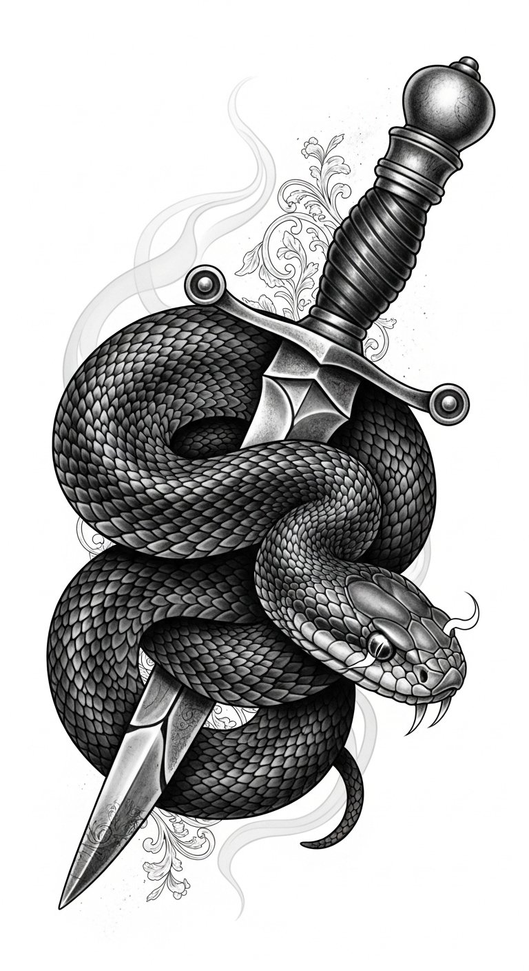 This design weaves together motifs of protection (dagger), transformation and rebirth (lotus), sovereignty (crown), and celestial guidance (moon) into a single flowing composition; place along the forearm or down the ribcage so the serpents’ curves follow the natural lines of the body, evoking balance and movement while the mixed styles—tribal accents and geometric shading—add personal edge and emotional resonance.