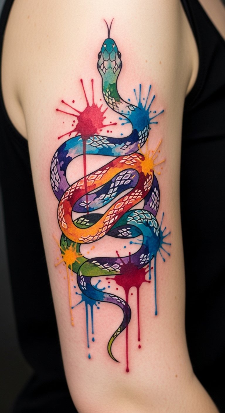 This design uses fluid washes and dripping pigments to evoke renewal and liberation; the snake’s abstract coils can wrap gracefully around the forearm, shoulder blade, or calf to emphasize movement and personal metamorphosis.