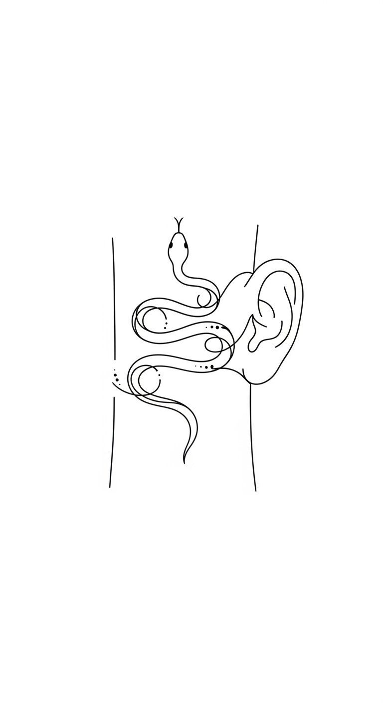 A thin, single-line serpent spiraling gently around the wrist or forearm, head small and tapering, a single dot for an eye, subtle negative-space curves suggesting scales; black ink only, fine needle, 2–4 inches long, flowing with natural body contours. This design symbolizes personal evolution, quiet resilience, and liberated identity; its understated emotion is contemplative and empowered, inviting private meaning while remaining discreet—ideal for the inner wrist, behind the ear, along the collarbone, or wrapping a finger where it can be revealed or kept intimate.