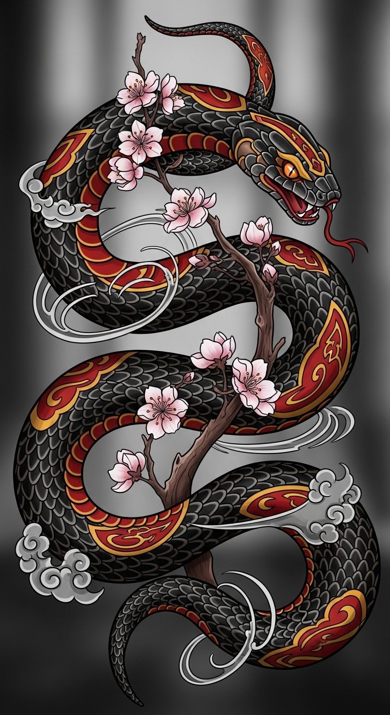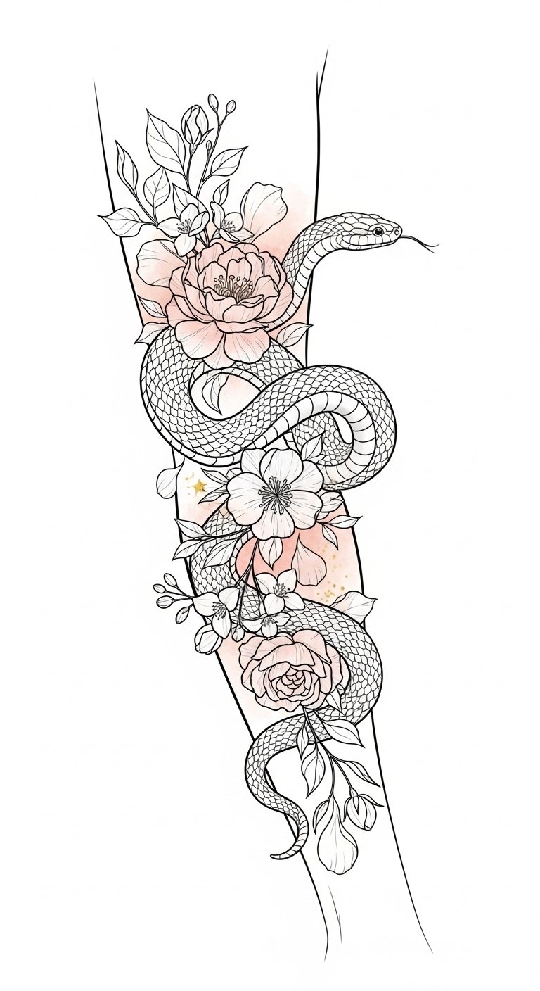 Picture a graceful floral snake entwined with blooming petals, symbolizing feminine elegance and resilience.