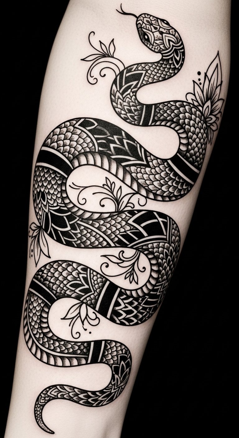 Combining floral elements with snake tattoos creates a striking juxtaposition that celebrates beauty and strength.