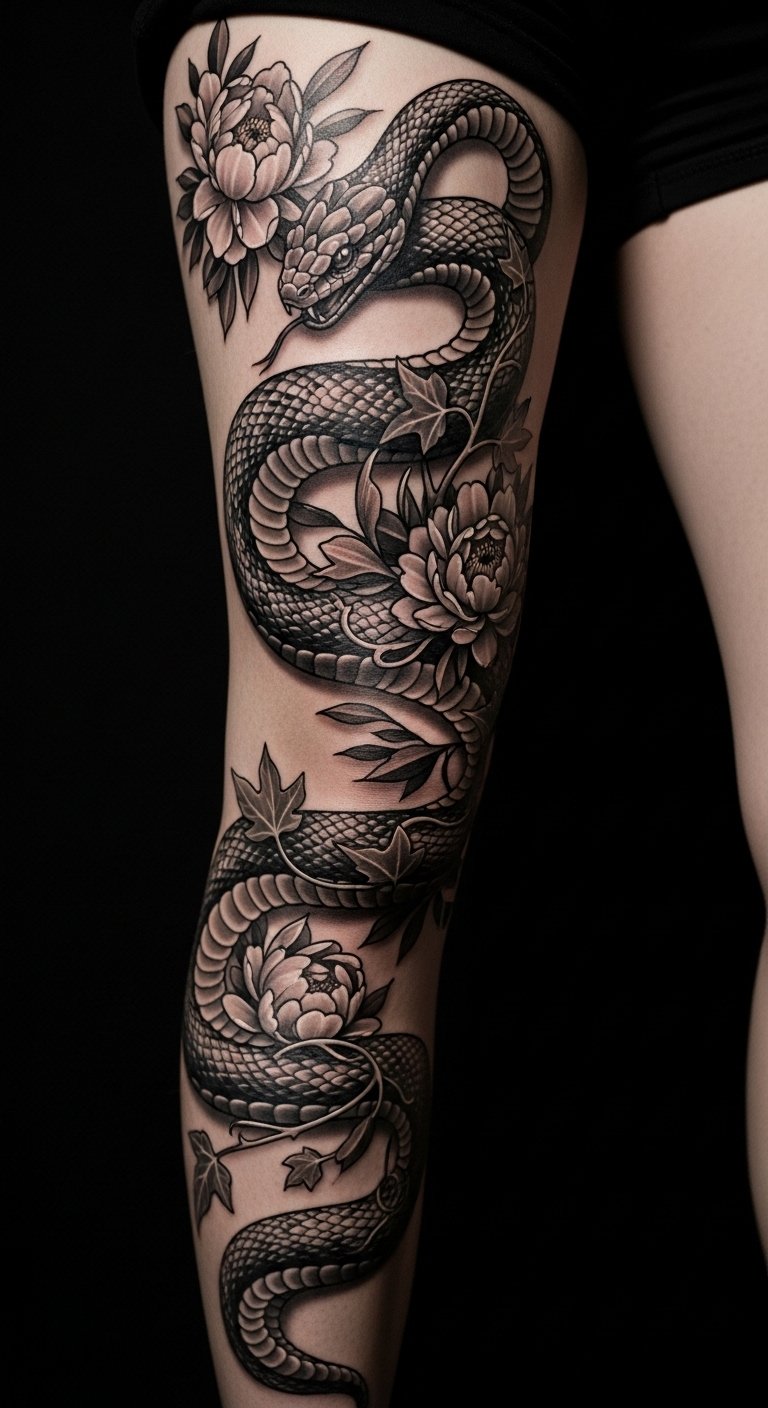 The design symbolizes transformation, protection, and sensuality—its sinuous motion evokes resilience and fluidity while the peonies and ivy soften the image with beauty and growth; placed to follow muscle lines (calf wrap for subtle movement, thigh S-curve for bold presence), it conveys confidence and an intimate, personal narrative.