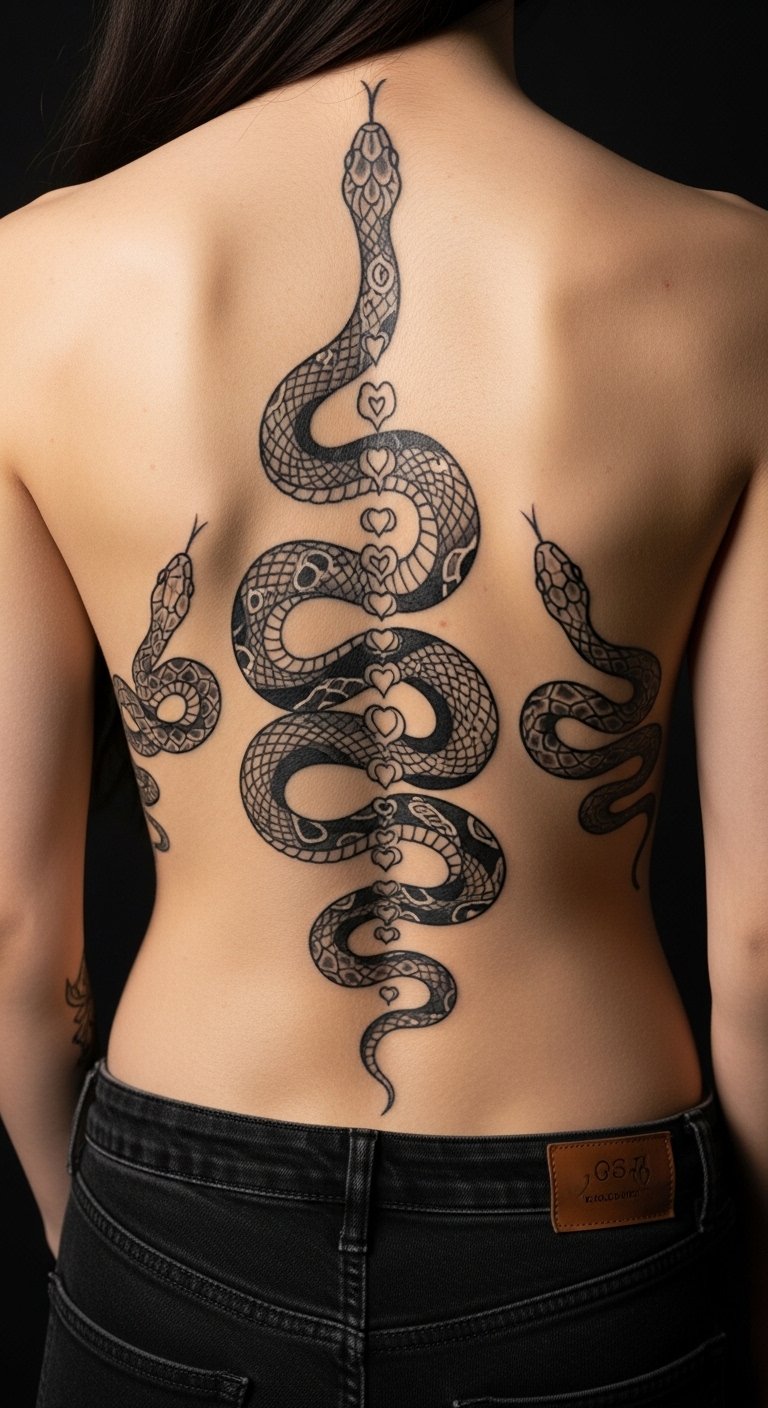 Snakes winding along the vertical line of the spine and contouring the ribcage symbolize personal evolution, resilience, and the balance between vulnerability and strength; positioned to flow with the body’s natural curves, the design evokes fluid motion and intimacy, encouraging wearers to reclaim power and celebrate their unique form while conveying a fierce, liberating emotional presence.
