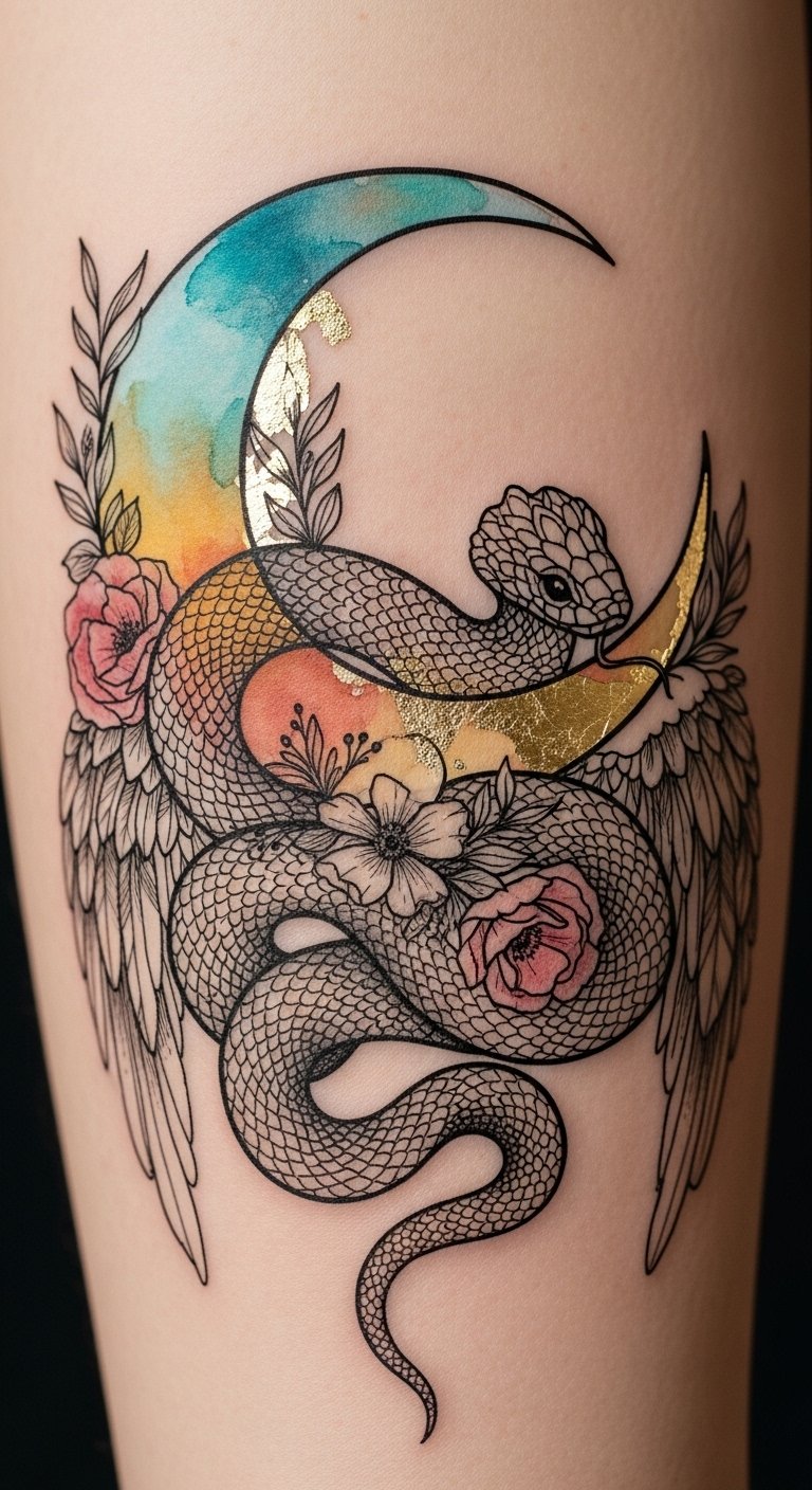 The design evokes protection, transformation, and a graceful, controlled strength—emotions carried by the sinuous movement and contrasting colors; it suits a sleeve or waist-to-thigh placement where the snake’s curve can follow the body’s lines, creating an intimate, protective visual that reads both bold and contemplative.