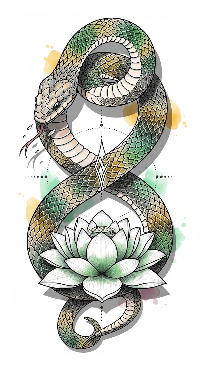 This design emphasizes intimate emotion through the lotus and serpent union—place along the forearm for visibility and flow, or the ribcage for a private, protective feel; the fine-line detail conveys vulnerability while the jewel tones and dotwork scales evoke quiet resilience.
