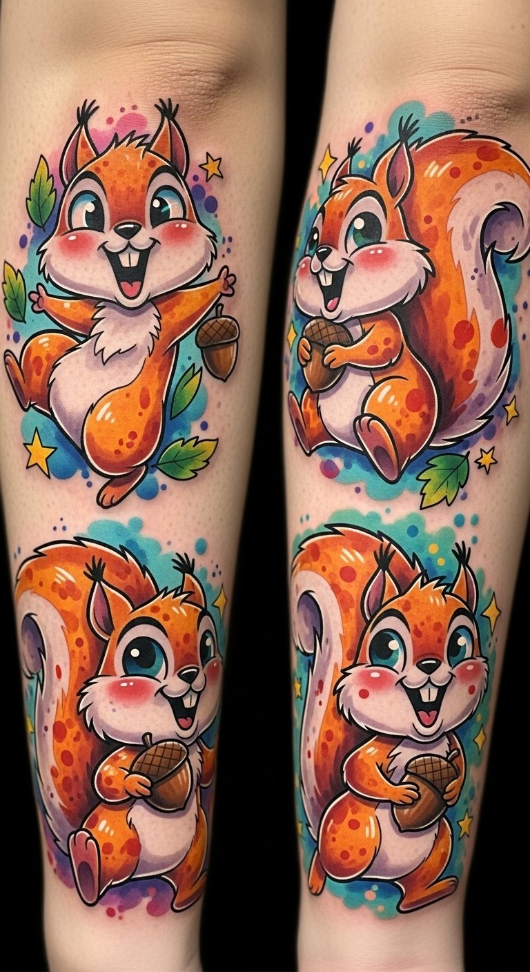 These playful cartoon squirrel tattoos symbolize joy, freedom, and a fun-loving spirit; they convey lightheartedness and celebration of small charming quirks, evoking warmth and whimsy.