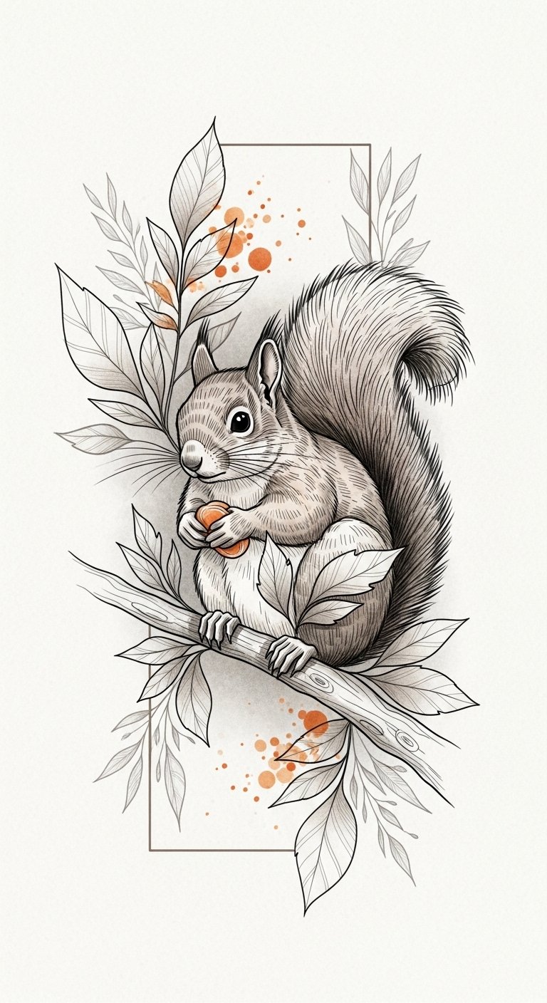 This design emphasizes gentle harmony and playful curiosity: the squirrel represents resilience and preparedness, while the surrounding leaves and branch convey rootedness and balance. Emotionally it feels warm and contemplative—comforting like a quiet walk through the woods—making it suitable for someone who values nature, growth, and personal grounding. Ideal placements include the inner forearm for visibility and daily reminder, the shoulder blade for a natural curve with the body, or the ribcage for a more private, intimate piece.