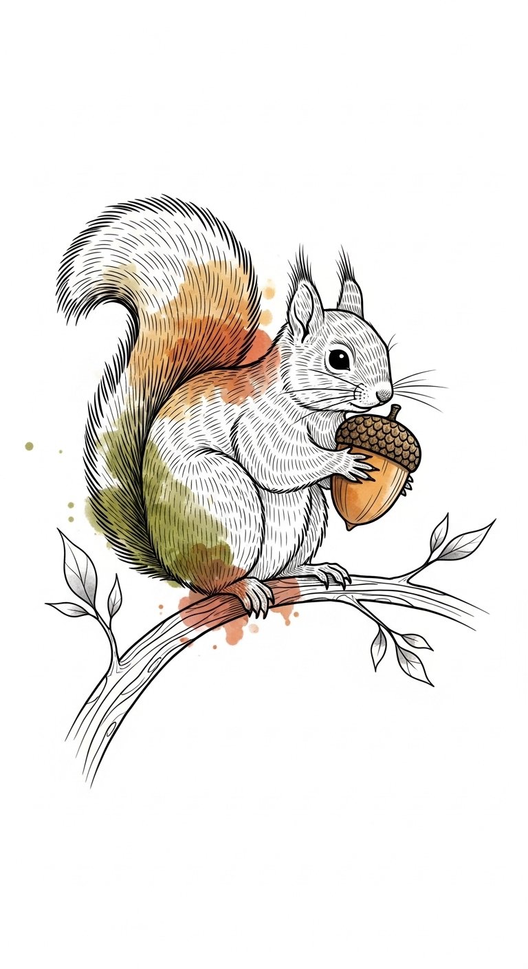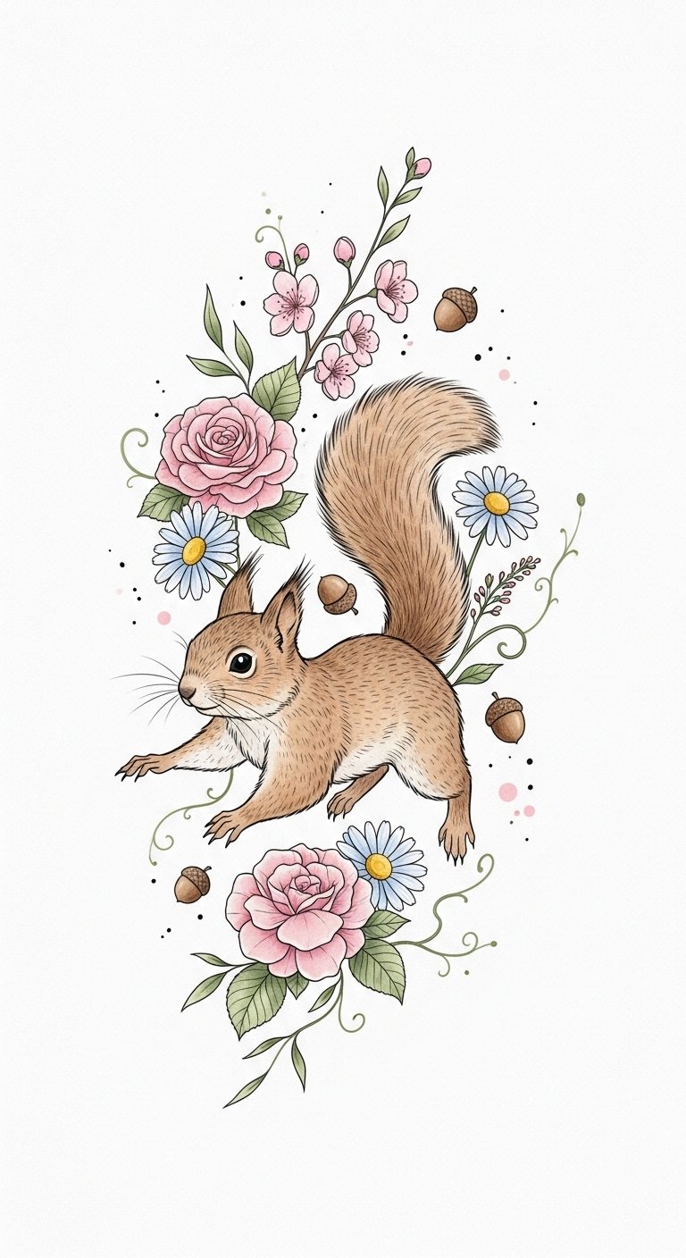 This design blends whimsy and personal storytelling: a small, playful squirrel rendered in a semi-realistic style with delicate linework and soft watercolor accents, clutching an acorn that subtly contains a tiny landscape within it; the composition evokes curiosity, agility, and a connection to nature, conveying emotions of joy, nostalgia, and quiet resilience; ideal placement options include the inner forearm for visibility and daily reminder, behind the shoulder for a more intimate keepsake, or near the ankle for a discreet, charming flourish.