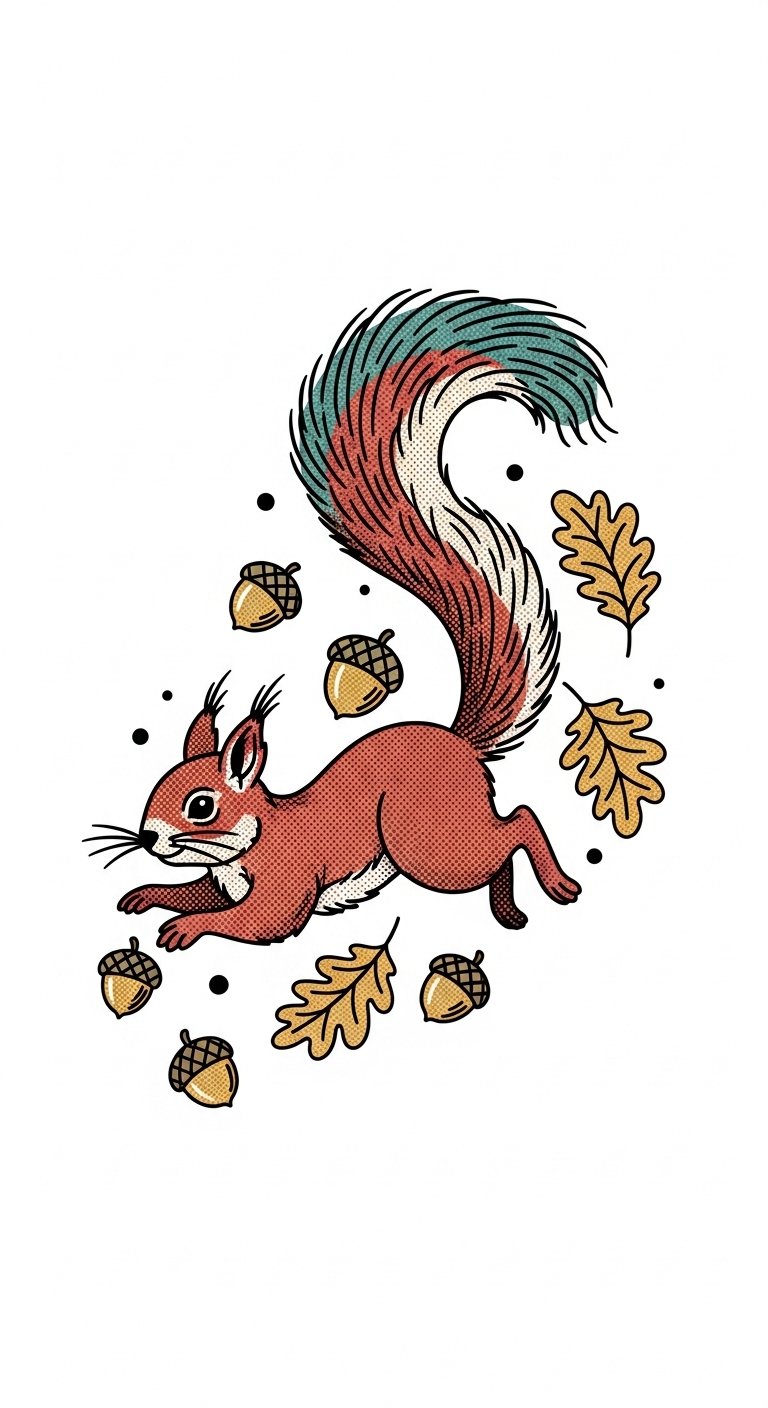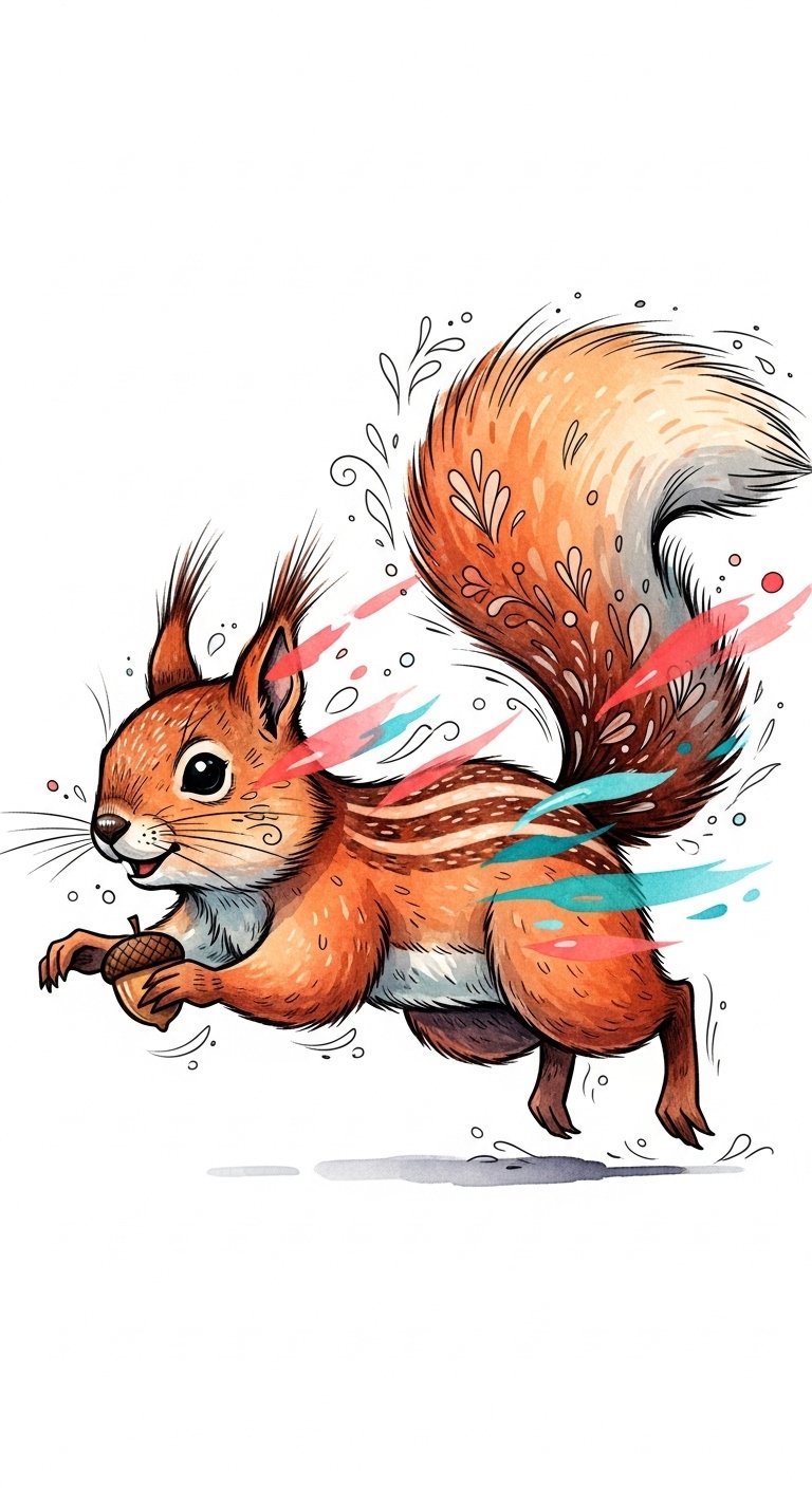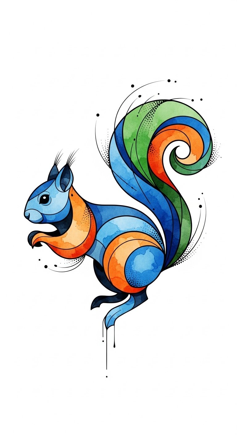 This design channels the squirrel’s lively movement and bright palette into a compact, dynamic composition—curled mid-leap with exaggerated tail flow, watercolor splashes and fine-line details blending orange, teal, magenta, and indigo.