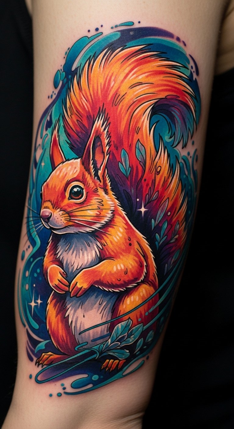 This design channels the squirrel’s energy and curiosity—symbolizing resourcefulness, playfulness, and protection—evoking warmth and nostalgia; ideal for placement on the upper arm or shoulder where the circular composition wraps naturally, allowing movement and color to interact with muscle contours for a lively, personal statement.