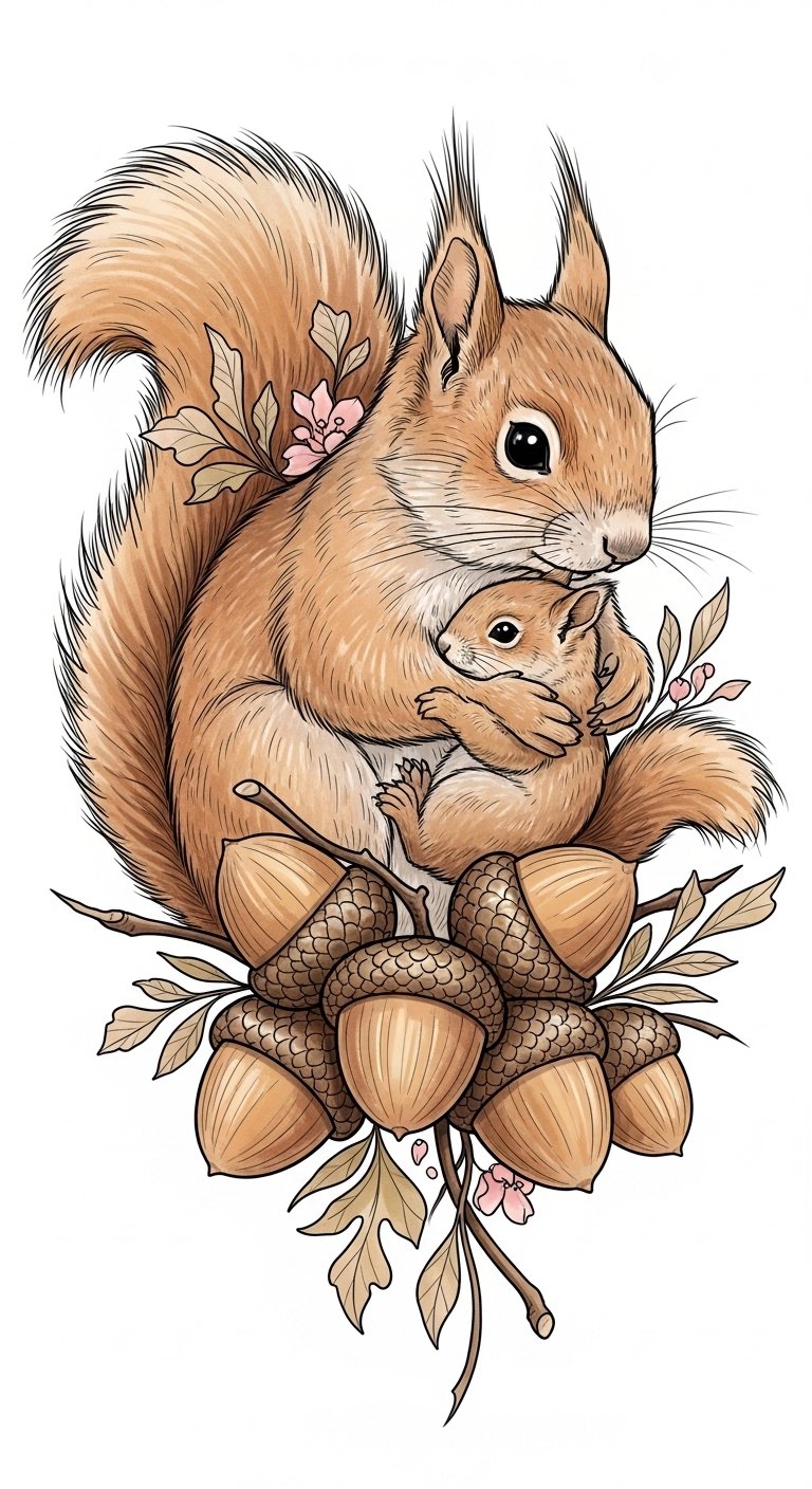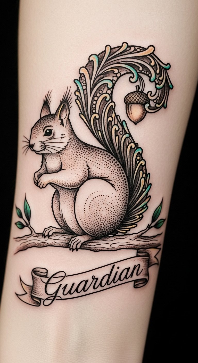 This inked reminder can inspire you to protect your loved ones and cherish the freedom that comes with nurturing those bonds. The design conveys quiet watchfulness and affectionate duty—soft sepia tones and delicate filigree evoke nostalgia and warmth while the curled tail shielding the acorn emphasizes sheltering care; ideal placement on the inner wrist or upper chest keeps the guardian close to the heart, offering a personal talisman of vigilance and love.
