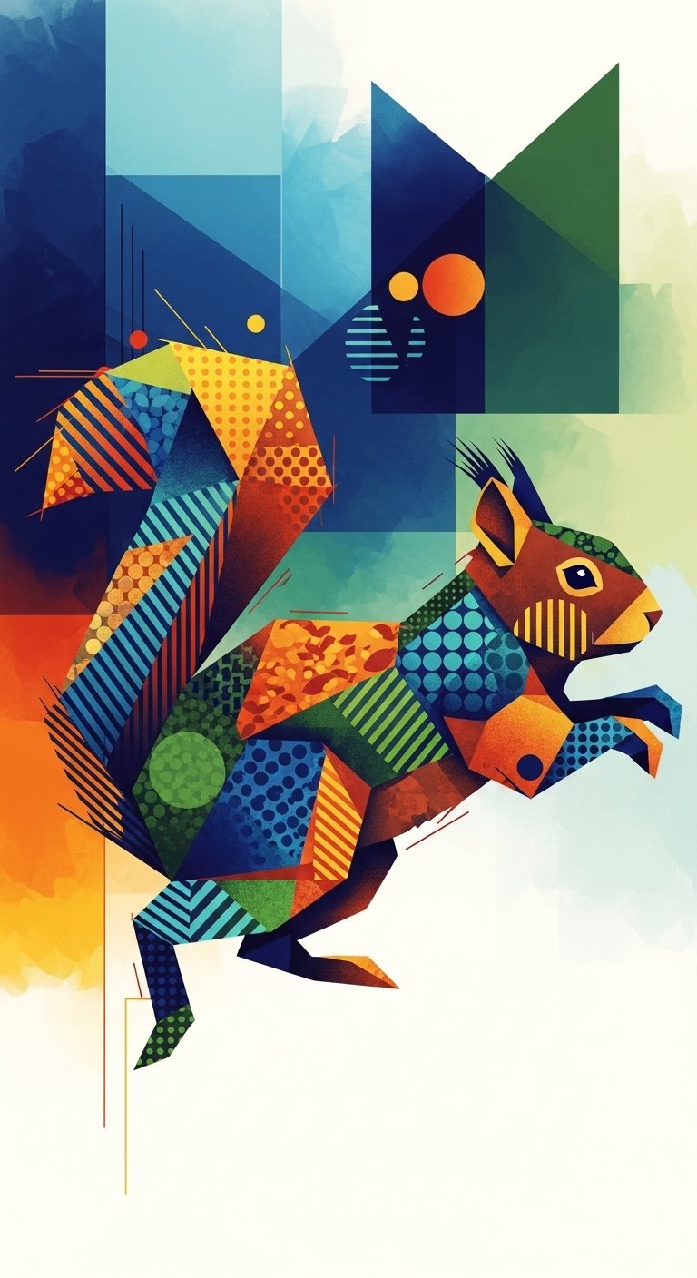 Embrace vibrant abstract squirrel colors, intertwining blues, oranges, and greens to symbolize freedom and creativity.