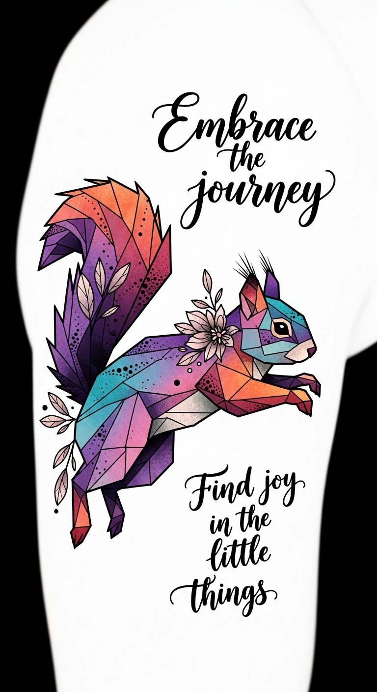 Geometric designs can beautifully complement a more whimsical approach to squirrel tattoos, especially when paired with inspirational quotes that resonate personally. Squirrel symbolism embodies resourcefulness and joy, making it the perfect canvas for motivational quotes. Imagine a vibrant squirrel leaping alongside words like “Embrace the journey” or “Find joy in the little things.” This combination sparks creativity and reminds you to celebrate life’s adventures. The tattoo would evoke playful resilience and mindful optimism, suited to visible placements like the forearm or shoulder where movement and daily sight reinforce its uplifting message.