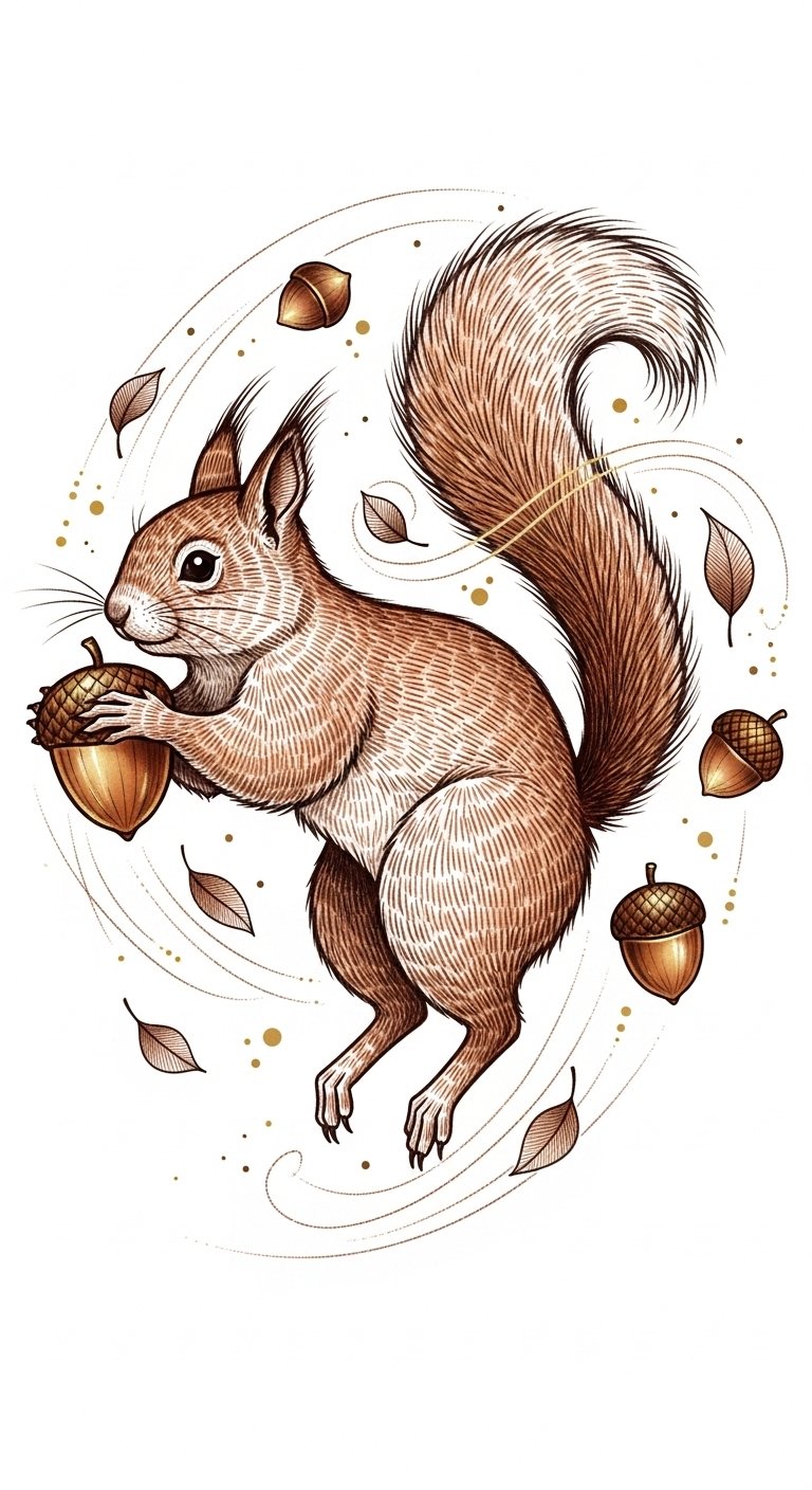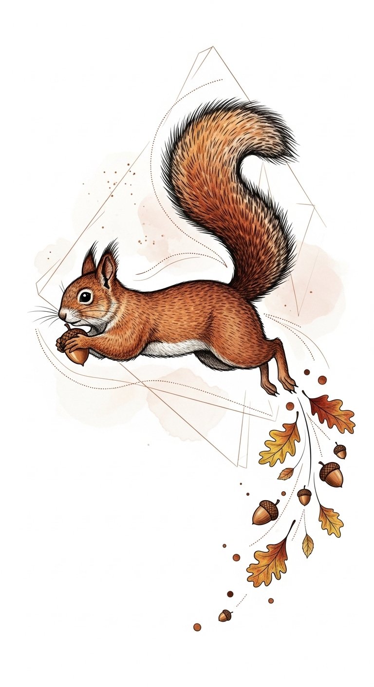 This design symbolizes playful freedom and the simple pleasures of nature, using the squirrel as a lively spirit of curiosity and the falling leaves to represent change and release.