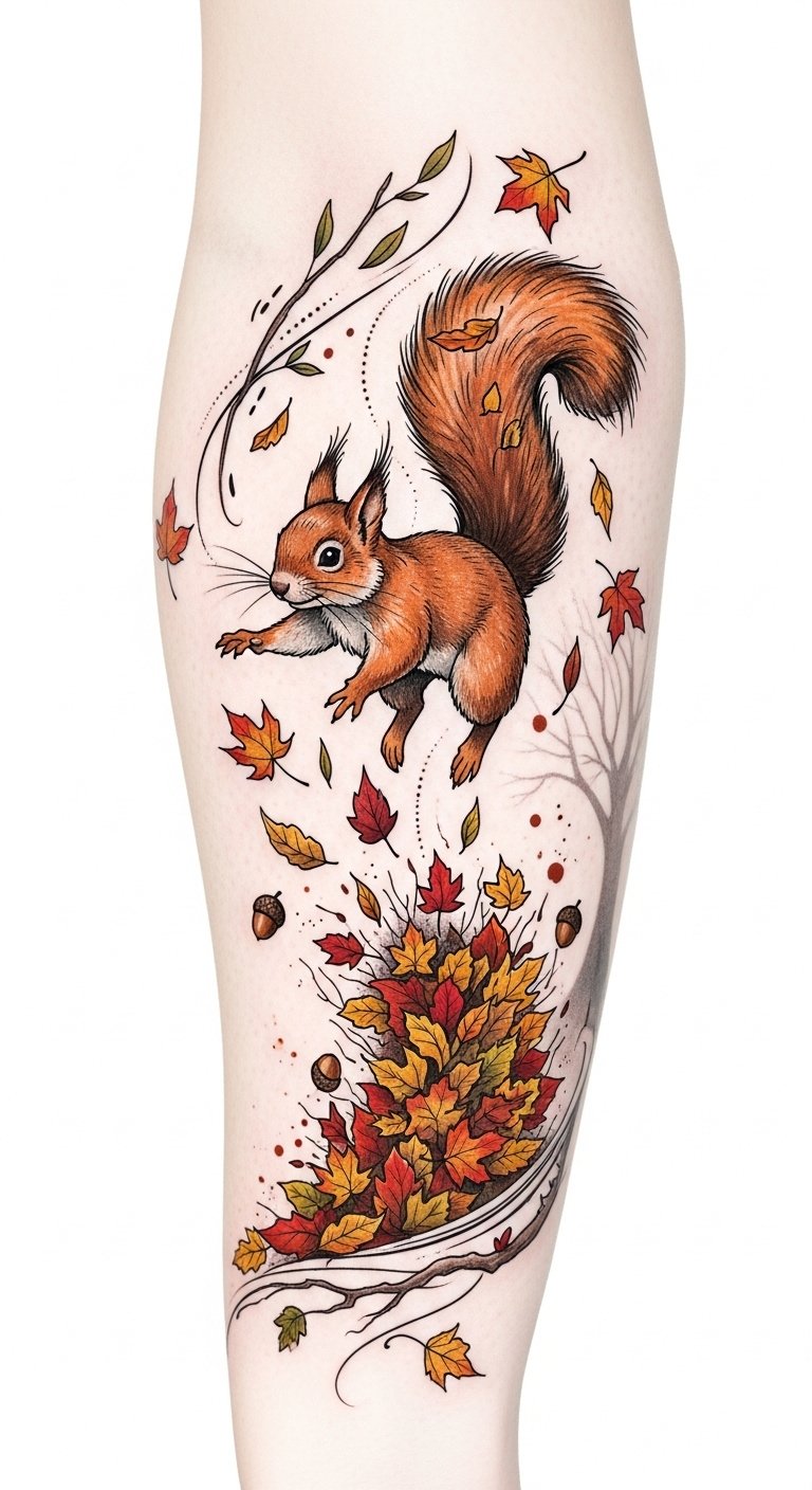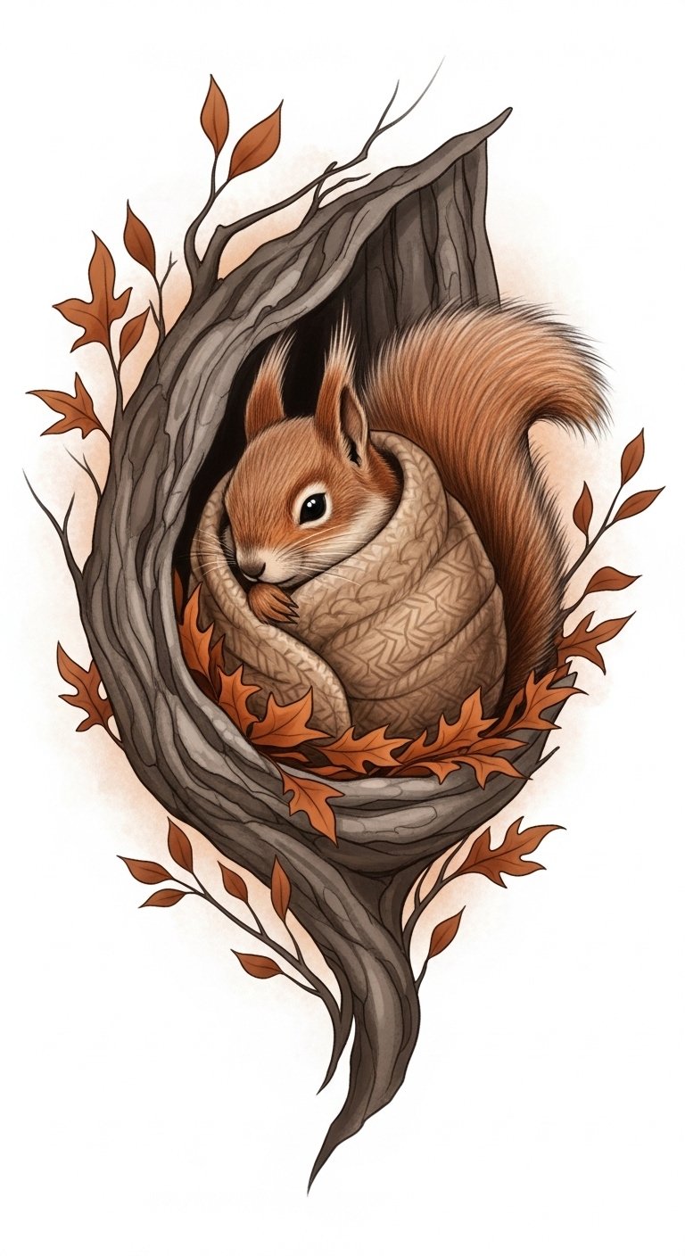 This tattoo concept blends gentle realism with soft linework and subtle watercolor washes to emphasize warmth and serenity; the squirrel, curled in a leaf bed or against a textured tree trunk, symbolizes home, comfort, and quiet resilience.