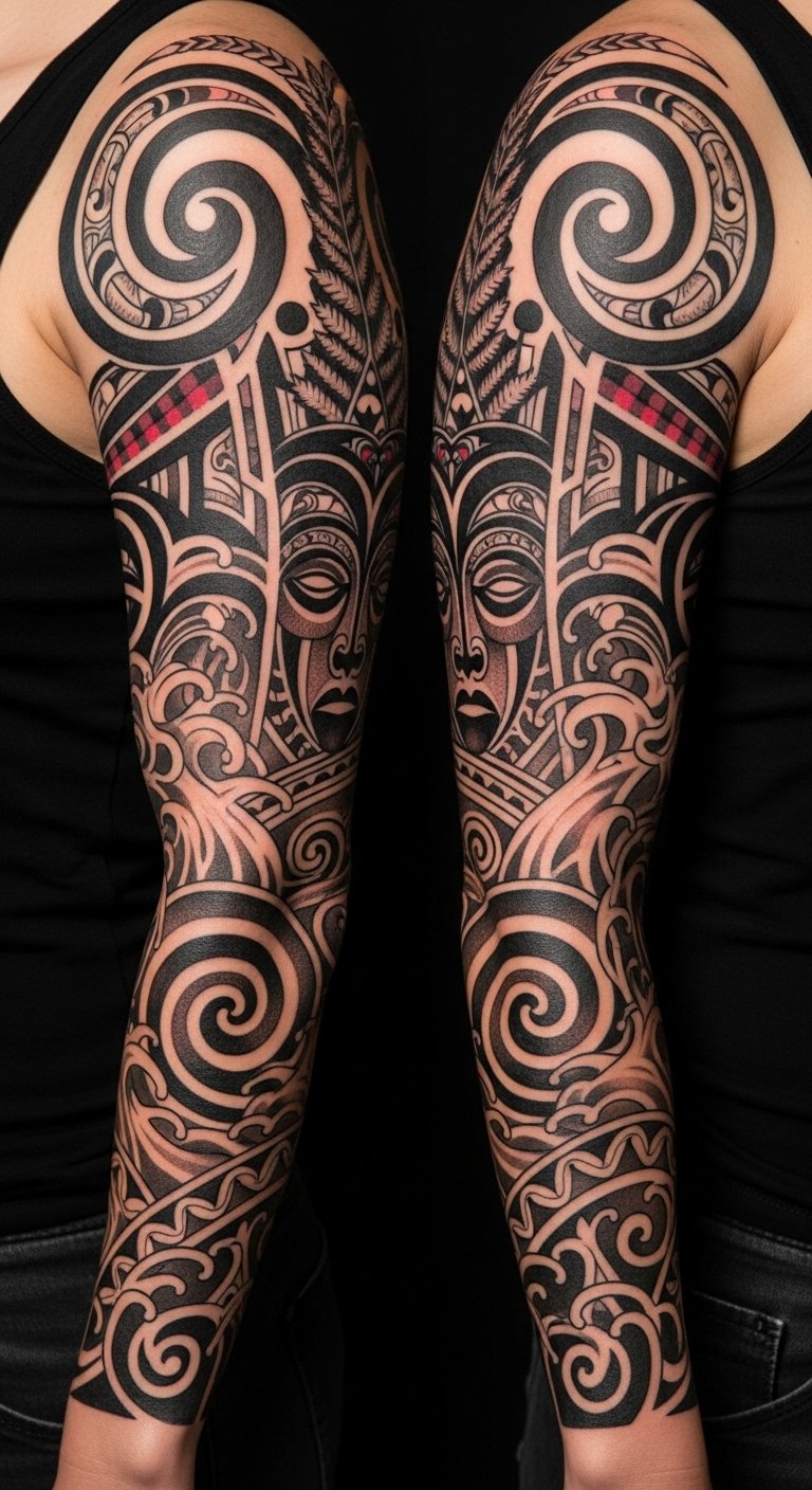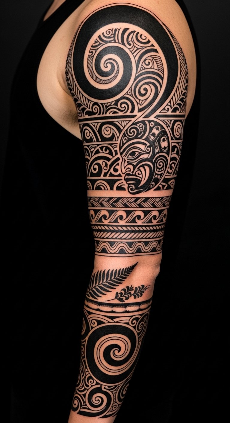 This sleeve concept uses koru spirals for growth and new life, vertical moko lines to denote rank and personal journey, ancestral silhouettes for lineage connection, and fern and wave motifs to represent land and sea; emotionally it should feel grounding, proud, and reverent.