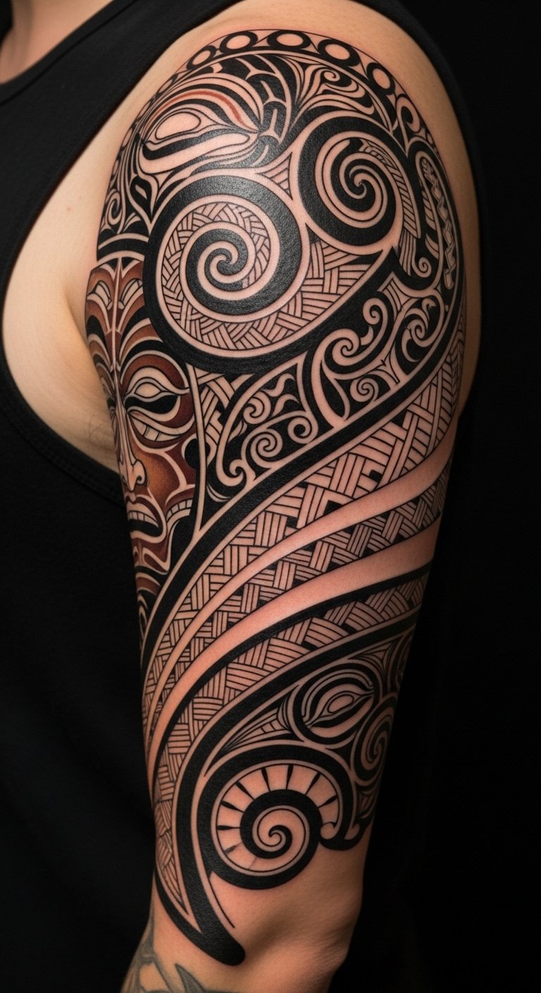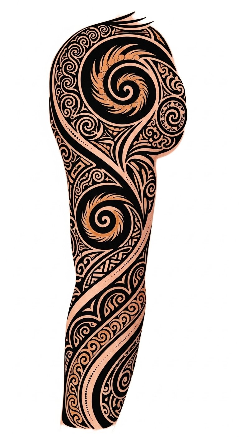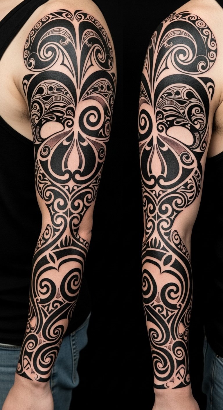 Ideal placement is full arm wrap from shoulder (mana, lineage) down to wrist (action, connection), with negative-space areas left for skin tone to read as sacred breathing room; consult with a Māori artist to ensure cultural protocols and accuracy.