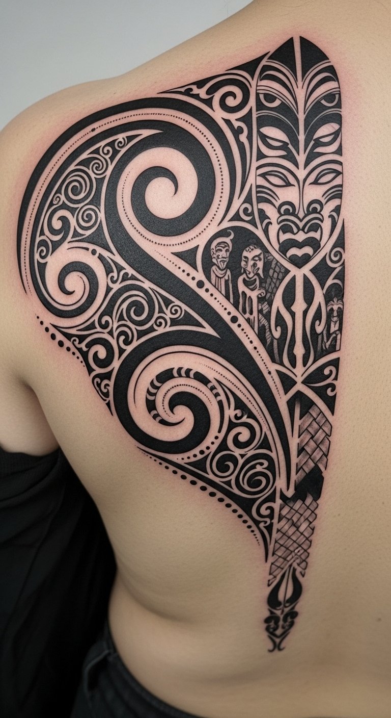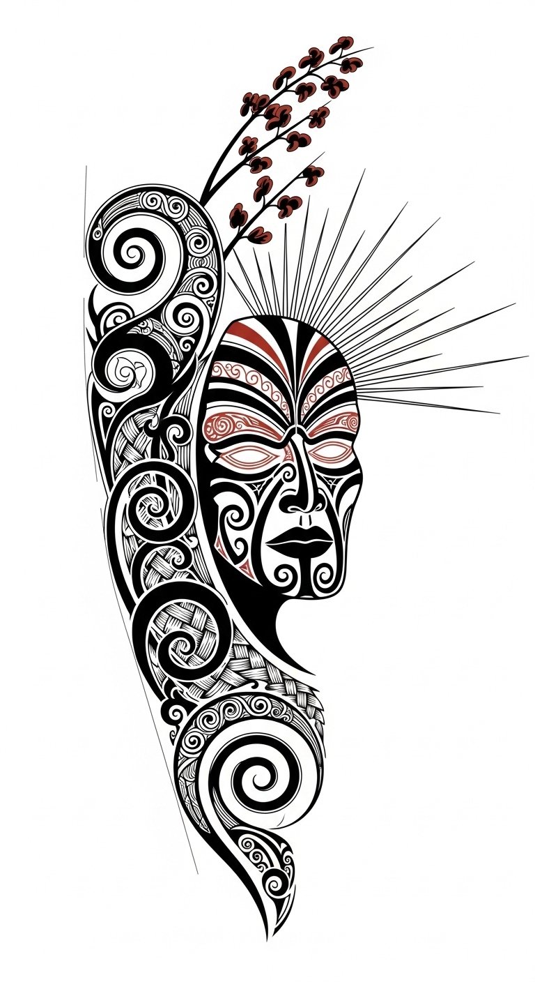 As a tattoo concept, the design weaves koru spirals for growth and renewal with manaia guardians for protection, tukutuku pattern bands to symbolize woven community ties, and stylized indigenous art motifs representing intergenerational transmission.