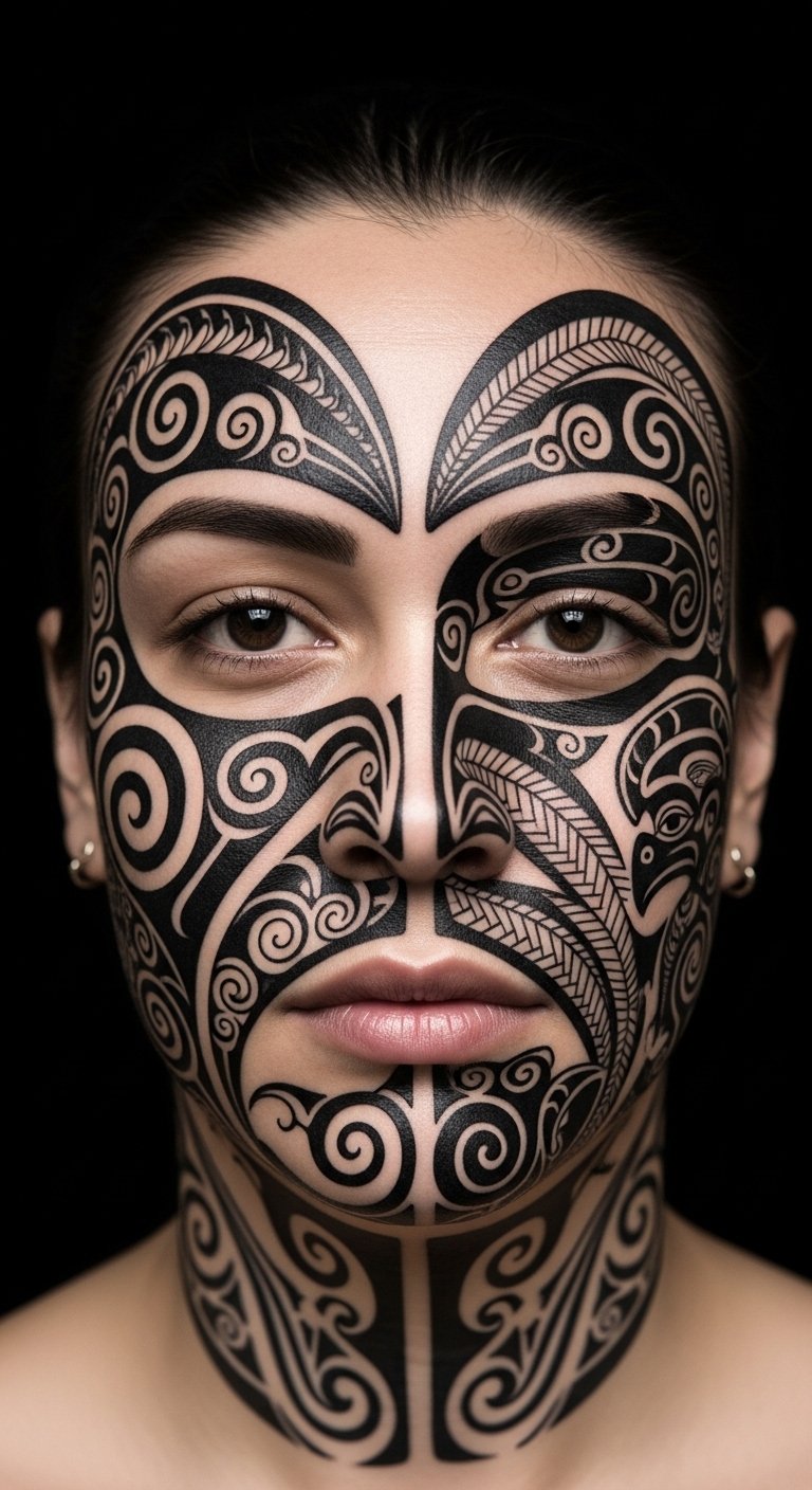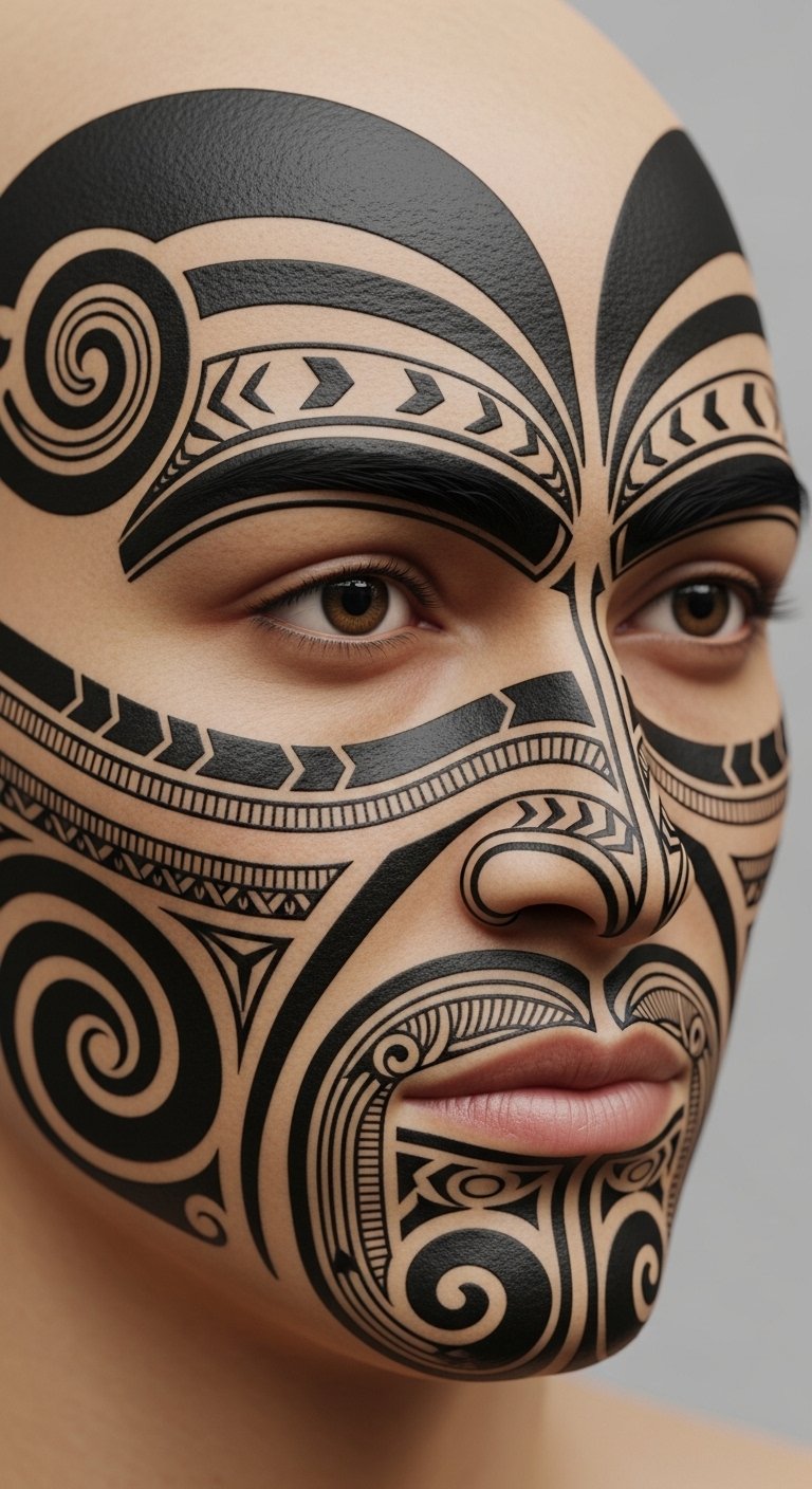 The design places koru spirals on the left to evoke inward reflection and life stages, while the right’s herringbone and manaia emphasize duty, kinship, and guardianship; use the forehead band to show continuity between self and society, stitch boldness for authority and fine lines for intimate history, and position shading to follow facial contours so the moko reads naturally in motion and expression.