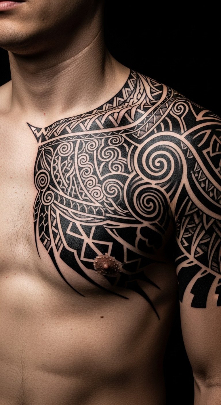The cultural significance of tā moko goes beyond aesthetics, connecting you to ancestral stories and the land, empowering you to walk confidently in your truth and freedom. This design centers the sternum as a personal crest—koru spirals signify new life and growth, ariki lines denote leadership and authority, and moko kauae elements honor lineage and voice; the left-shoulder extension maps personal journey and protection, the subtle whenua contours tie the wearer to ancestral land, and the high-contrast execution evokes solemn pride and calm confidence when placed across the chest and upper arm.