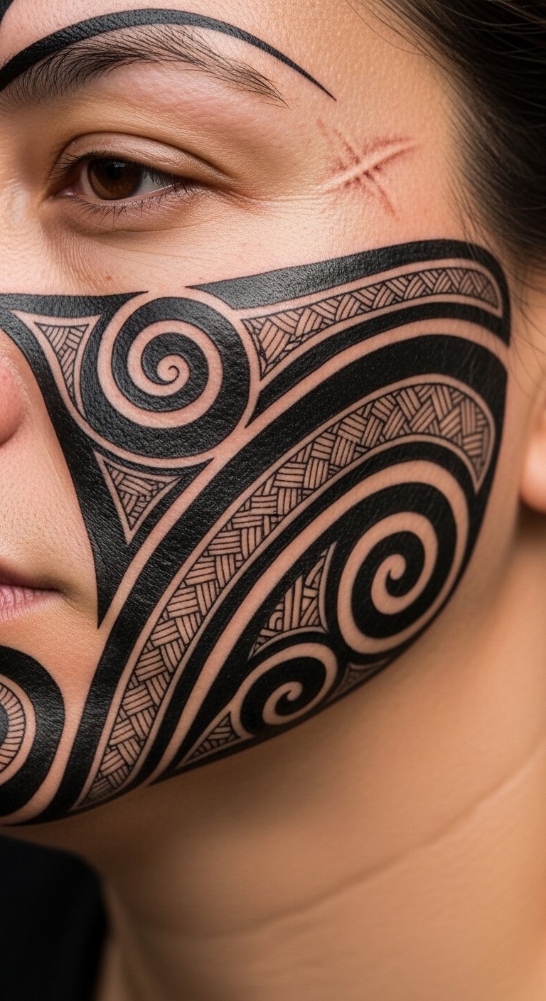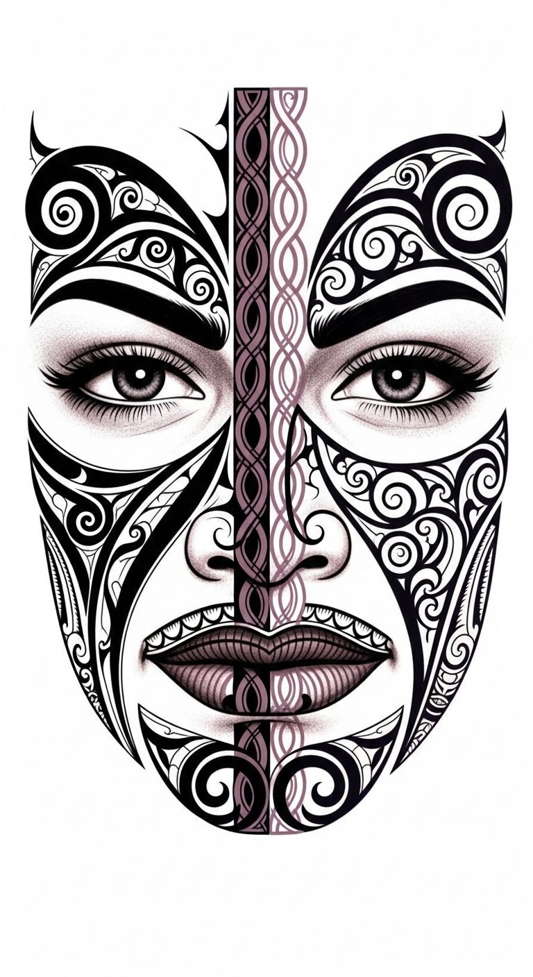 The design concept is meant to convey lineage and personal journey through entwined koru that unfurl from a central manaia, the bold negative spaces representing resilience and the fine lines denoting knowledge passed down; placed along the jawline and cheek to follow natural facial contours, it evokes strength and connection, intended to feel both intimate and public, eliciting reverence and quiet pride in the wearer.