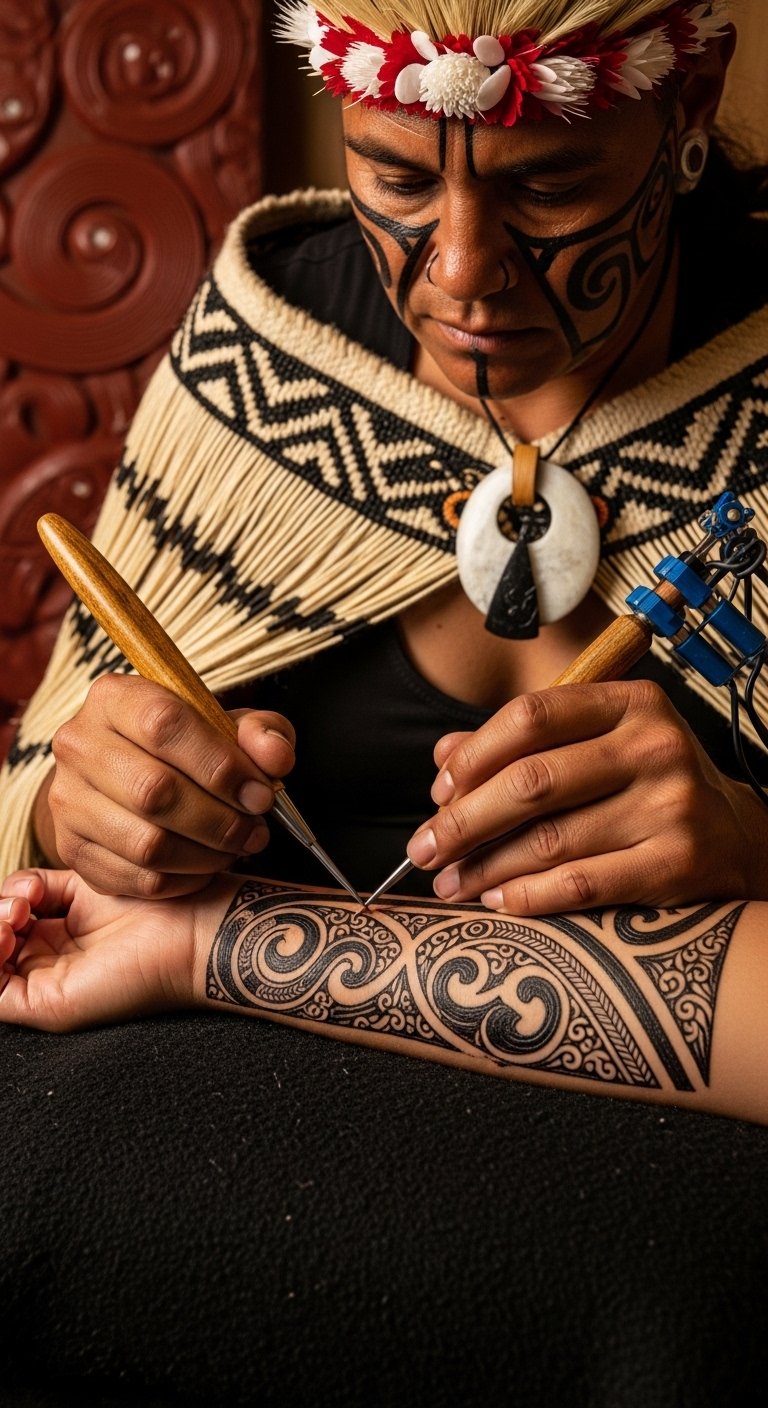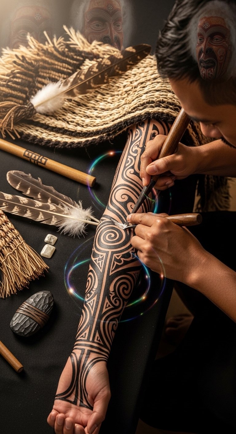 This design concept centers on koru and manaia motifs flowing along the forearm, the uhi marks rendered with visible depth to convey the ritual’s permanence; the surrounding ceremonial objects and faint ancestral visages evoke continuity, reverence, and emotional gravity.