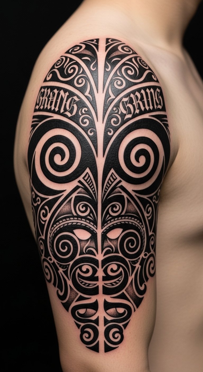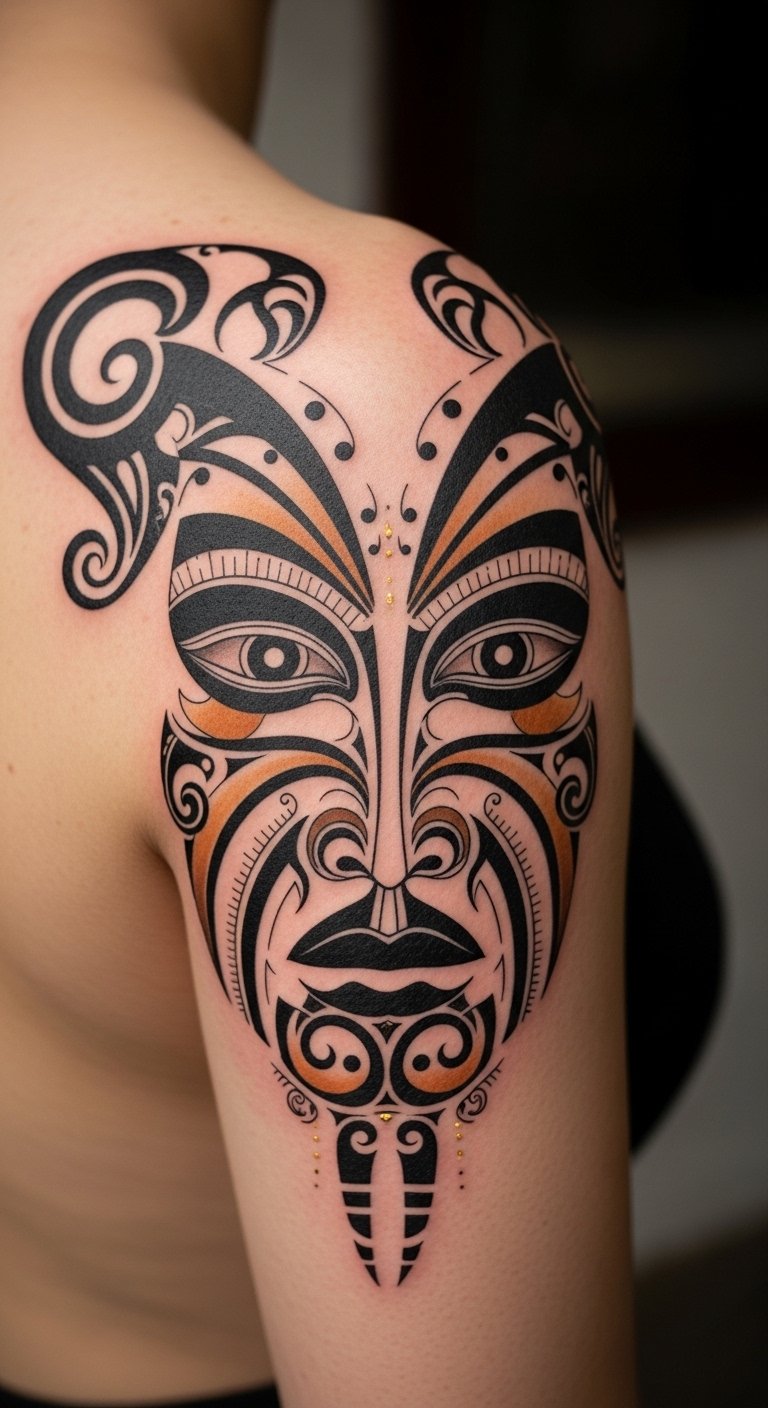 Placed on the shoulder blade or chest, the tattoo flows with musculature to feel like an organic extension of the body, evoking solemn pride and intimate connection to ancestry while using restrained accents and traditional patterns to honor cultural protocols.