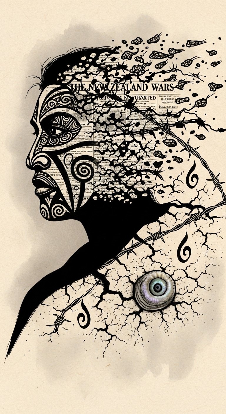 This design melds grief and resilience: the dissolving moko and newspaper imply erasure and imposed narrative; barbed wire and cracked earth convey oppression; the koru and paua evoke regeneration and identity reclaiming.