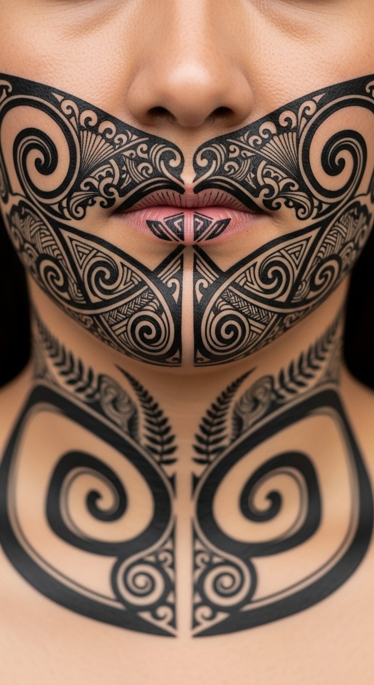 The design centers on koru curves for growth and fern elements for connection to land, with interlaced lines representing ancestral ties; emotionally it conveys pride, resilience, and reclaimed dignity, intended for chin placement following natural jaw contours to honor tradition and personal meaning.